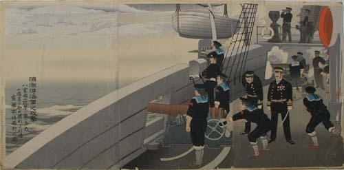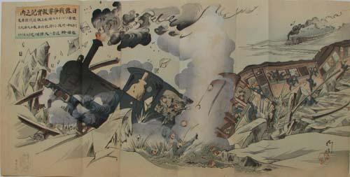 Title: Battle Scenes at Sea and on Train
