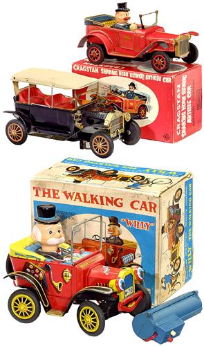 3 Japanese Tin Toy Cars, c. 1960 1) "Ford Model T", manufacturer: "Nikonkogei Co.", 10 1/2 in. long, 4 actions, detachable tin roof. - 2) "Cragstan": "Shaking, horn blowing antique car", with box. - Both cars are battery-operated! - And: 3) "Willy - The Walking Car", c. 1960, Japanese battery-operated tin toy car, manufacturer: "Yonezawa Toys", lithographed tin, rubber head, remote control, length: 7 3/4 in., original box. Fully working condition. It walks, it rolls, rider shakes and its face lights up - very funny!<Br>