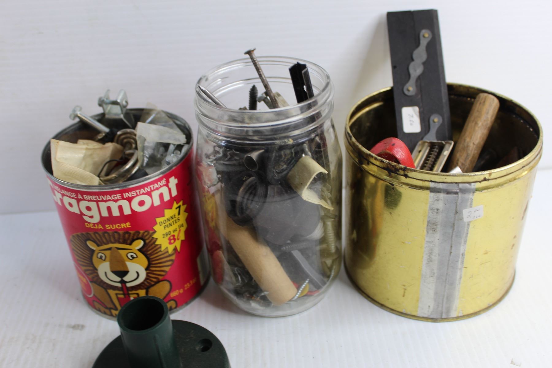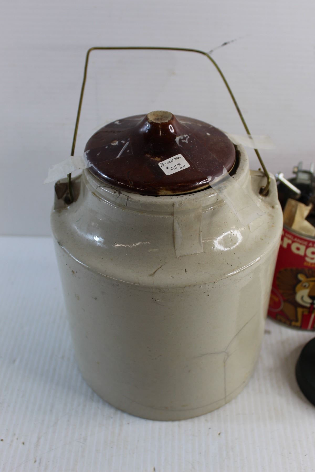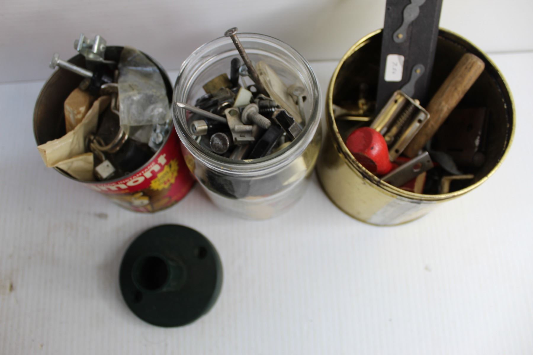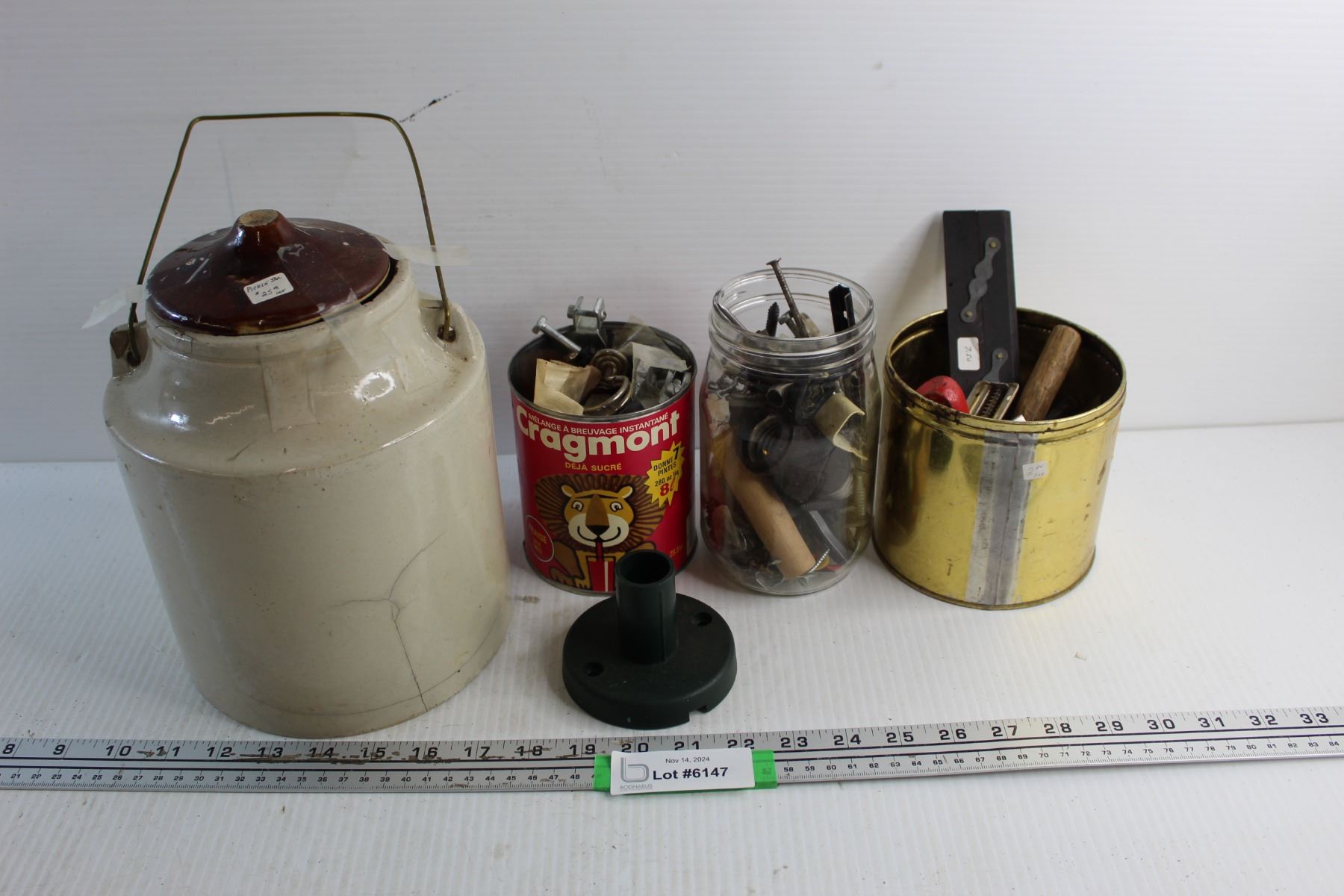 (3) Jars/ Tins Full Of Various Hardware Items, Vintage Stoneware Pickle Jar- Has Crack