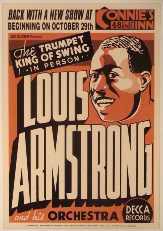 These 3 Jazz Concert Posters are from the Golden Age of jazz, and feature some giant stars and memorable concerts.Medium: Print on heavy poster stock Size: 17" x 24" Publisher: Jazz Age Editions Condition: Excellent Louis Armstrong and his orchestra