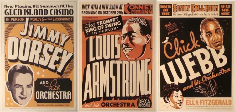 These 3 Jazz Concert Posters are from the Golden Age of jazz, and feature some giant stars and memorable concerts.Medium: Print on heavy poster stock Size: 17" x 24" Publisher: Jazz Age Editions Condition: Excellent Louis Armstrong and his orchestra (Connies's Inn)Jimmy Dorsey and his orchestra (Glen Island Casino)Chick Webb and his orchestra ft. Ella Fitzgerald (Savoy Ballroom)Note: These are older reproduction prints, not original posters