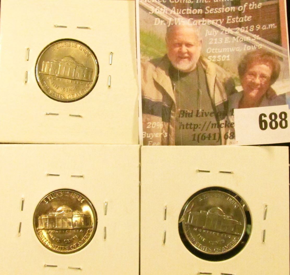(3) Jefferson Nickels, 1940, 1940-D, 1941, all BU, group value $7 to $20
