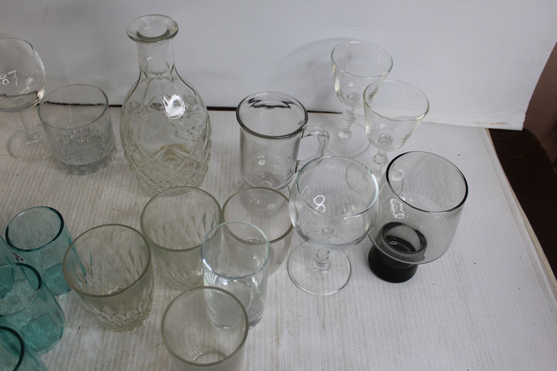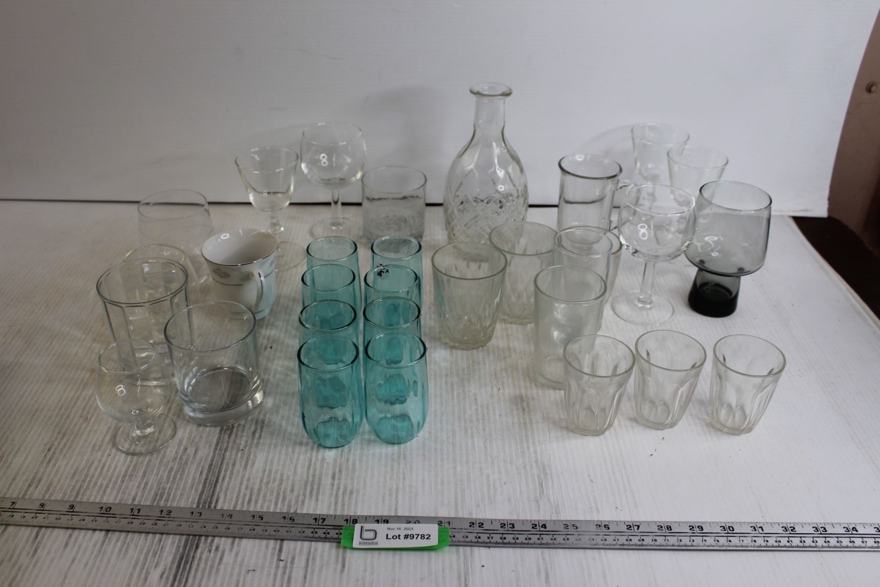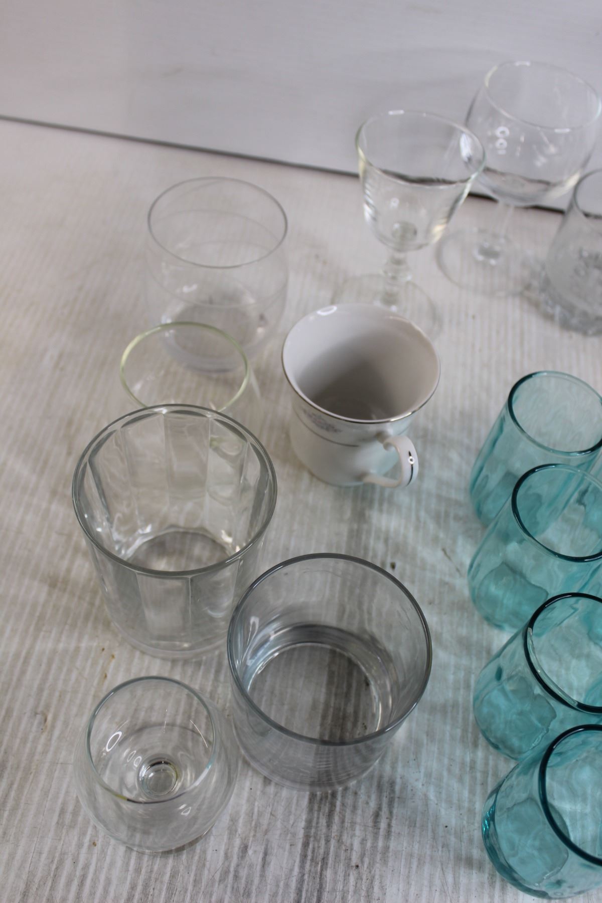 (3) Juice Glasses, (8) Small Blue Glasses, Mug, Assorted Glassware