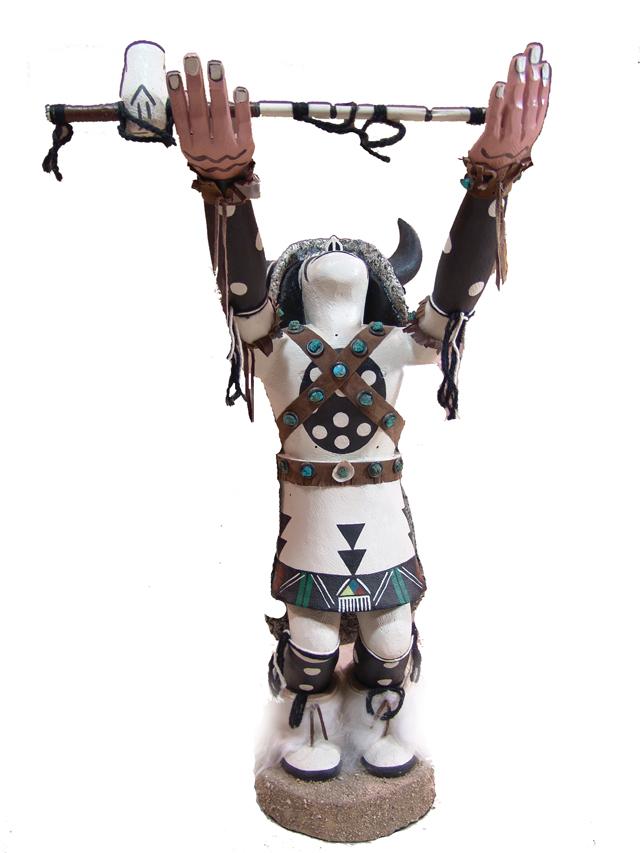 Circa 1988, Very large carved cottonwood kachina figure - a buffalo dancer - shown with his arms outstretched offering a peace pipe. 30" x 16" x 18"
