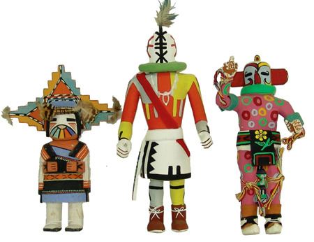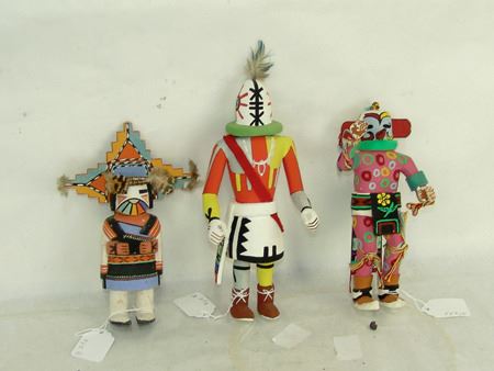 Mid/Late 1900s, Collection of three colorful and finely hand carved and painted Hopi kachina dolls. All in very good condition. Tallest 9"