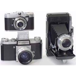 1) "Ercona II", 6 x 9, Zeiss Tessar 3,5/105, Tempor-Verschluß, Tasche. Sehr schöne Kamera. Verschluß löst nicht aus. - Beautiful condition, shutter does not release. (2/5) - 2) "Praktica FX 2", SLR 24 x 36, Zeiss Biotar 2/58, mit Tasche, ausgezeichnet! - With case, excellent condition. (2/2) - Und: 3) "Taxona", 24 x 24 mm, Tessar 3,5/37,5, Tempor mit Tasche, ausgezeichneter Zustand. - With case, excellent condi-tion. (2/2) - Sowie: 4) 2 Prospekte "Praktica FX". - € 150/200 - (107/21)