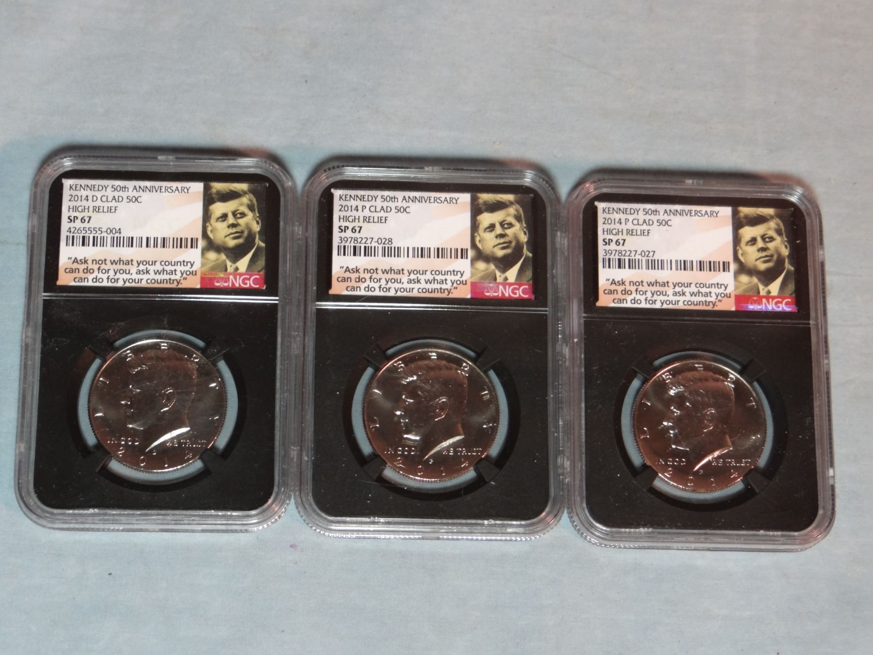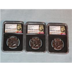 3 Kennedy half dollars, silver clad, NGC SP 67, 2 x 2014 and 1 x 2014 D