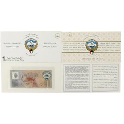 <B>Lot of Three Second Anniversary of the Liberation of Kuwait Commemorative One Dinar Notes.</B></I> Each of these special one dinar notes was issued by the Central Bank of Kuwait in commemoration of the Second Anniversary of Liberation Day. Each note measures 6.75" x 2.75" and each has a special holographic image inset at the upper right margin of the recto. Each note is free mounted in a special 9" x 4.75" card folder, dated February 26, 1993 with a brief history of the liberation in both English and Arabic. Each of these is then enclosed in a special cover envelope. All specimens are in fine condition. <BR><BR><b>Shipping:</b> Flat Material, Small (<a target="_blank" href="http://www.heritageauctions.com/common/shipping.php">view shipping information</a>)