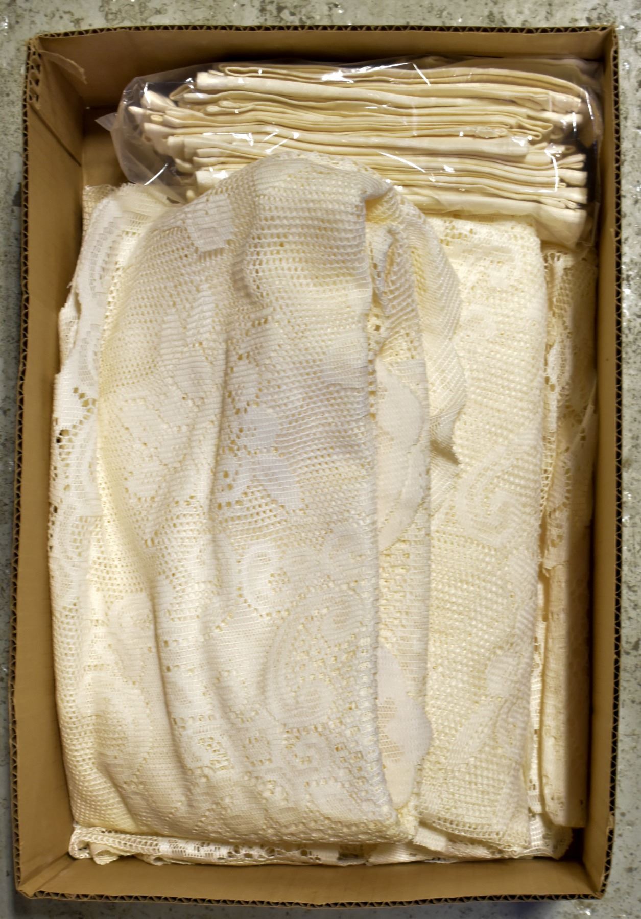 3 LACE TABLECLOTHS AND 12 CLOTH NAPKINS