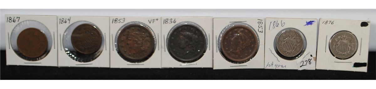 1836 & TWO 1853 LARGE CENTS, 1864 & 1867 2 CENT PIECES, 1866 & 1876 SHIELD NICKELS FROM SAFE DEPOSIT - SOLD PER COIN TIMES 7
