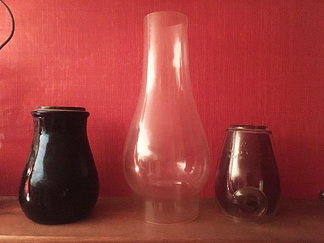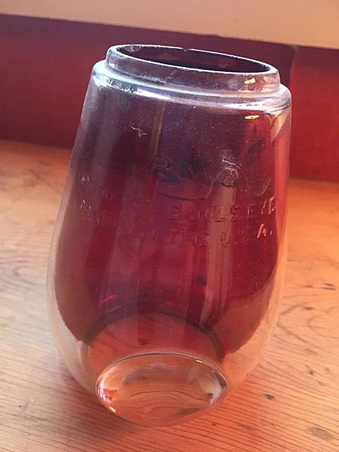 3 Lantern Globes include red globe, one is marked Rayo, Pony CB Bullseye, Made in the U.S.A., and hurricane globe.