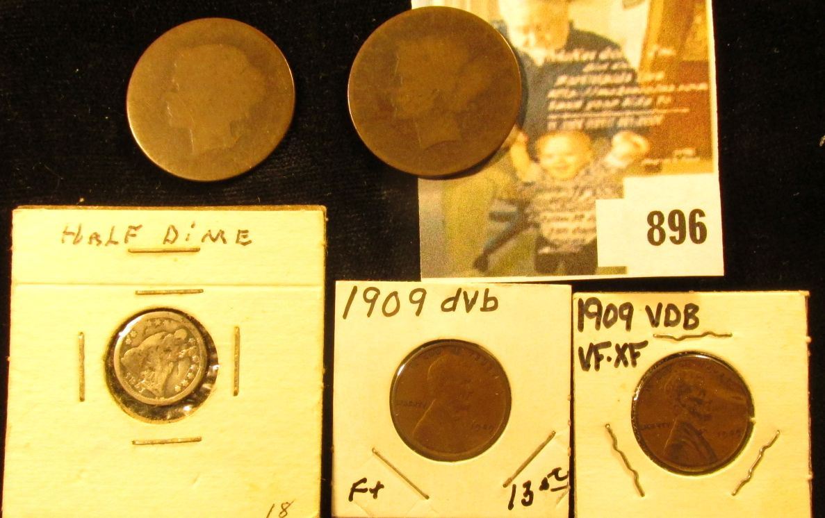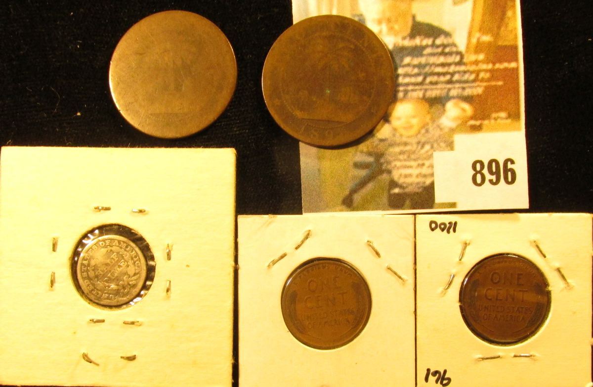 (3) Large Cent size old Coppers; 1851 Seated Liberty Half Dime; & a pair of 1909 P VDB Lincoln Cents.
