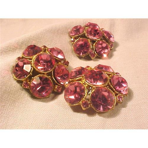 3 large buttons with large fuchsia pink faceted glass stones. These buttons are amazing. They catch the light and sparkle up a storm. <p> They measrue 1 1/4" in diamter. They are set in metal. The condition on all 3 is excellent.