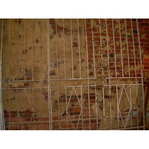 Up for sale are three primitive iron gates. These gates were originally decorative window guards on a late 1800's building. They are in wonderful shape. They were painted white at one time and are now peeling--they have a wonderful primitive or shabby chic look. Each gate measures 26.5"(w) by 83"(t) and the outside thicker edge of the gate is 1.25" deep (the inner iron measures .75" deep). Just a wonderful bit of antique architecture. All three sold as one unit.