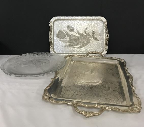 3 Large Serving Platters - all in good pre-owned condition. The largest platter measures 26 x 15.75 inches & is made by Wilcox & is called ‘Rochelle’ & is silver platted. The round platter is glass with no