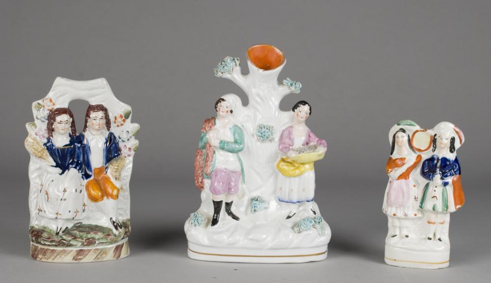 Largest depicting a male carrying a sack and female carrying a basket with tree between them, open reservoir to hold a quill, 8" H. Second depicting a couple sitting together holding wheat or ear of corn, 6.5" H. Third depicting a couple standing, 5" H. All in very fine condition with surface dirt and faded paint.