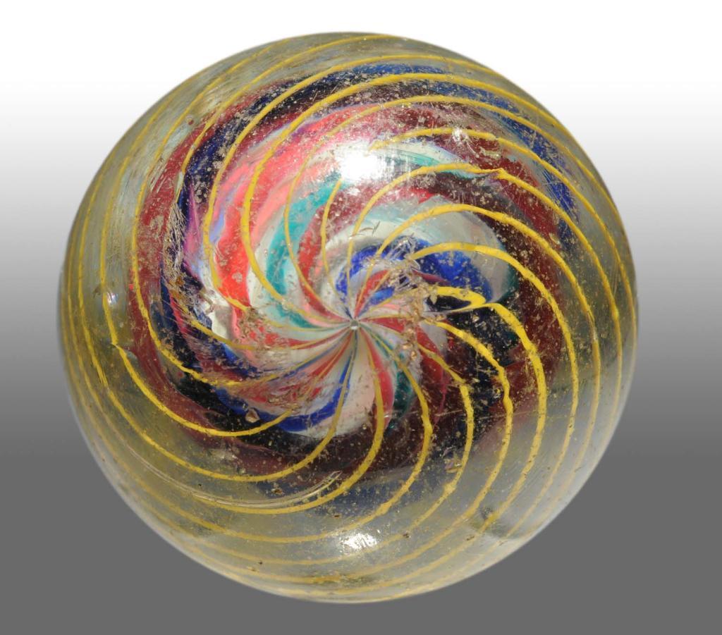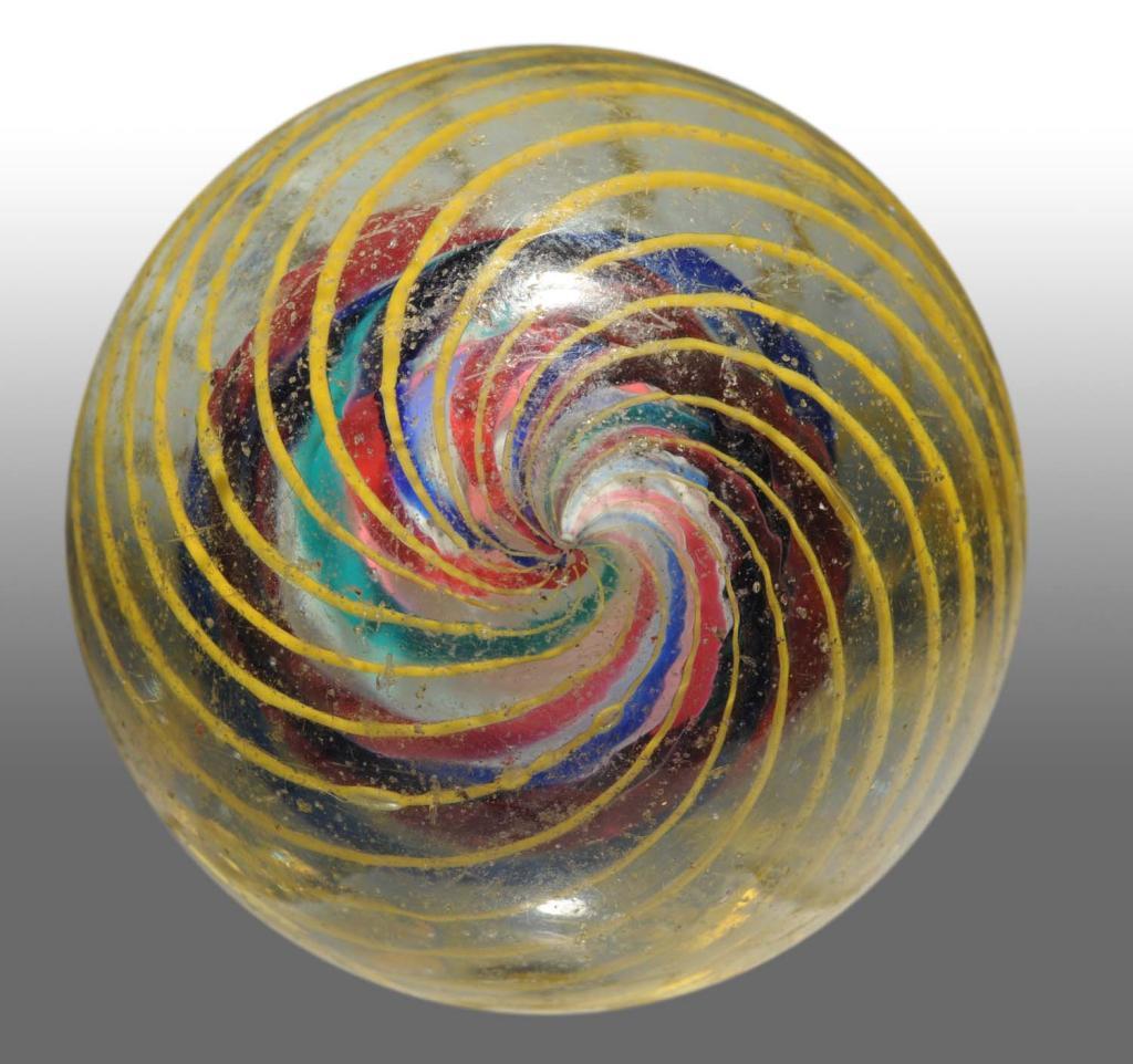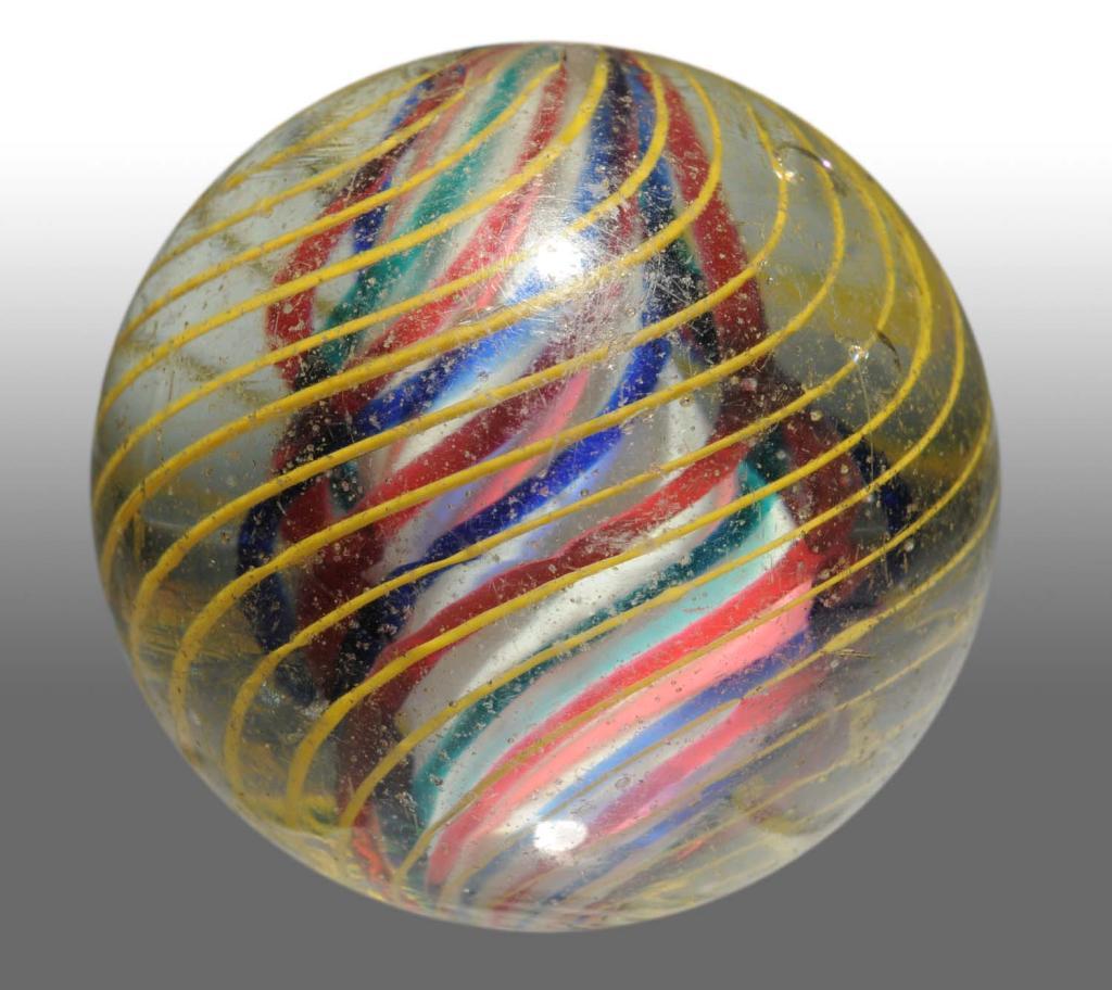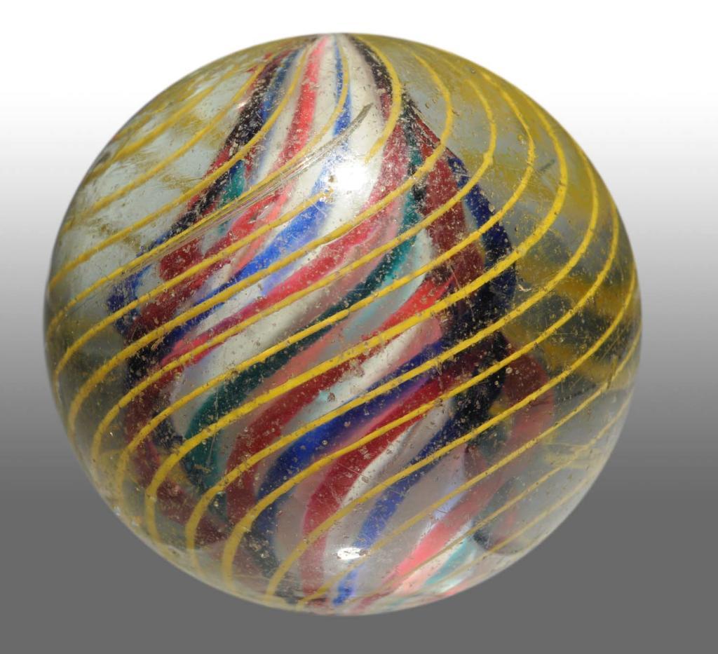 This marble has a nice, solid white core with alternating blue, green and red bands and outer stage of yellow banding throughout marble. Condition (9.2). Size 1 - 5/16" Dia.
