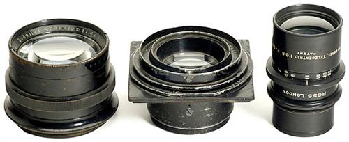 3 Objektive von Ernemann, Heaton und Ross 1) Ernemann: "Doppel-Anastigmat 4,5/150 mm", Optik für einäugige Reflexkamera von Ernemann, Irisblende (3/3). - 2) Schneider für Heaton: "Zodeliar Anastigmat 4,5 No. 7", mit Irisblende. Heaton war ein renommiertes britisches Photohaus in London (3/3). - Und: 3) Ross, London: "Telecentric 6,8/9 in.", Irisblende, sauberes Exemplar (2-/3).