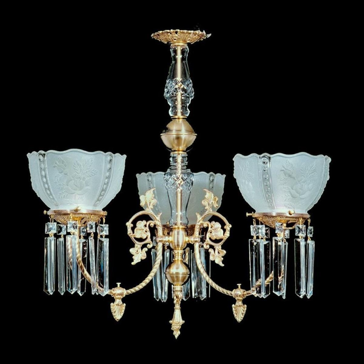 The hand polish brass on these Victorian chandeliers to create and authentic and rich satin finish. Ornate arm backs and gas-cut offs complement the rope turned brass arm. Cut crystal pieces form the stem. 25" wide x 23" tall 3 lights Medium base, 60 watt max per socket. Assembled in US of imported and domestic components. UL Dry Location 15 lbs This chandelier is designed to hang on chain, and chain and mounting hardware are included.