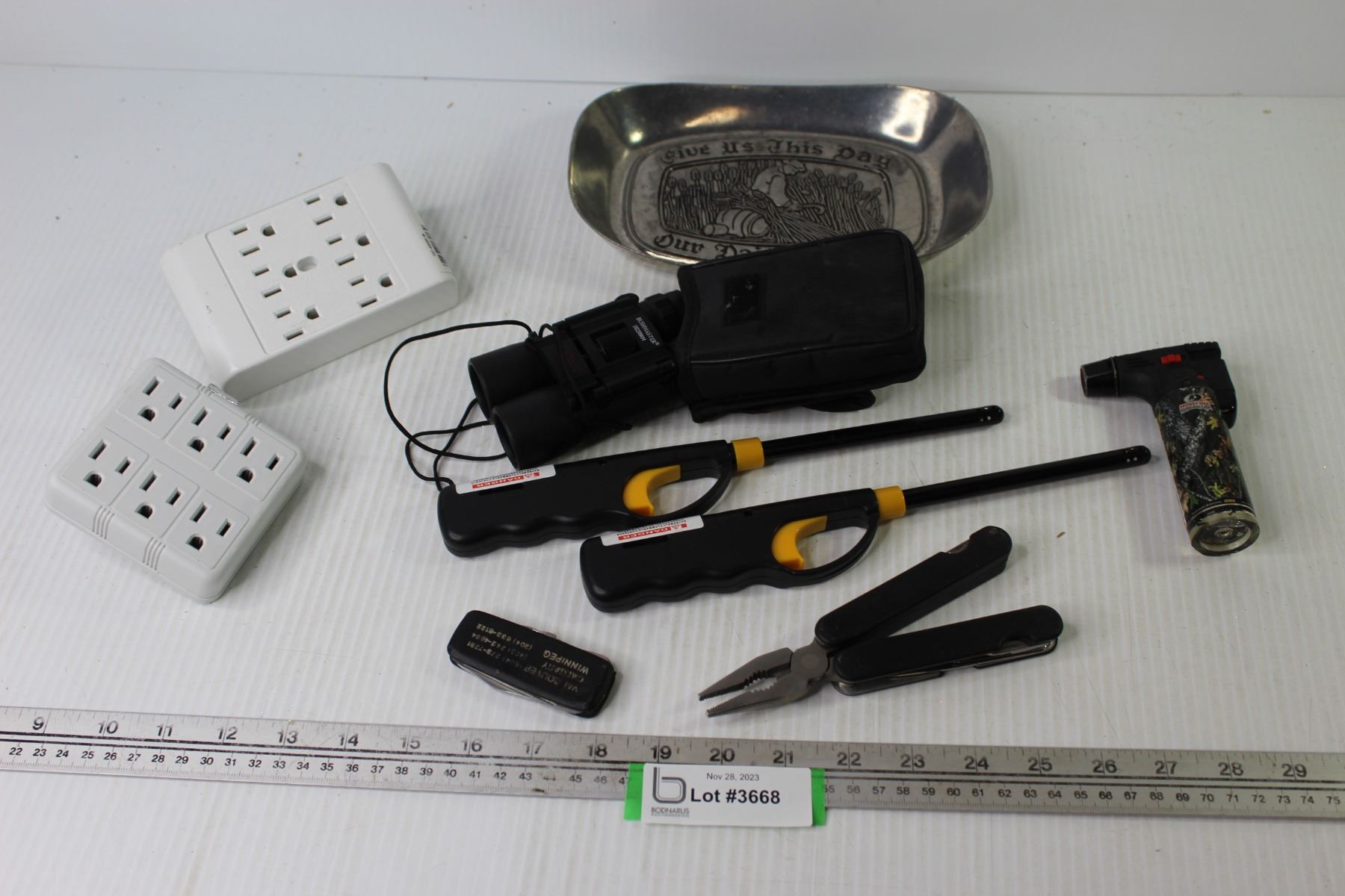 (3) Lighters - Bush Master Binoculars - (2) Multi Plug-Ins - Our Daily Bread Metal Dish - Multi Tool - Pocket Knife