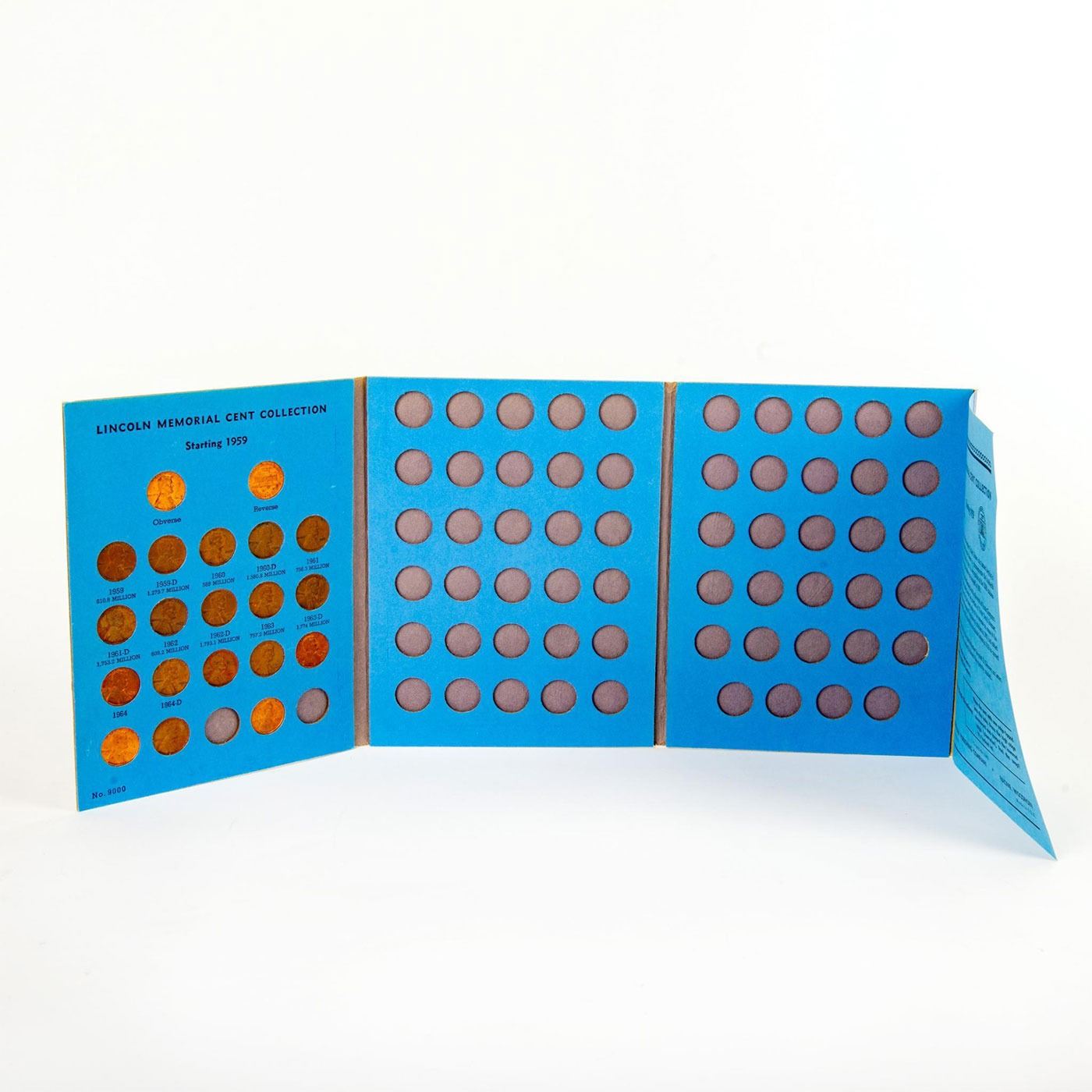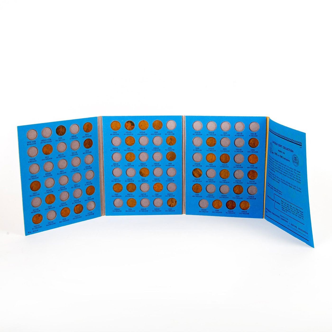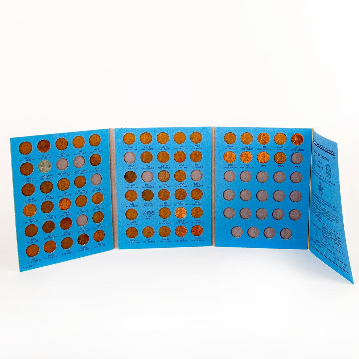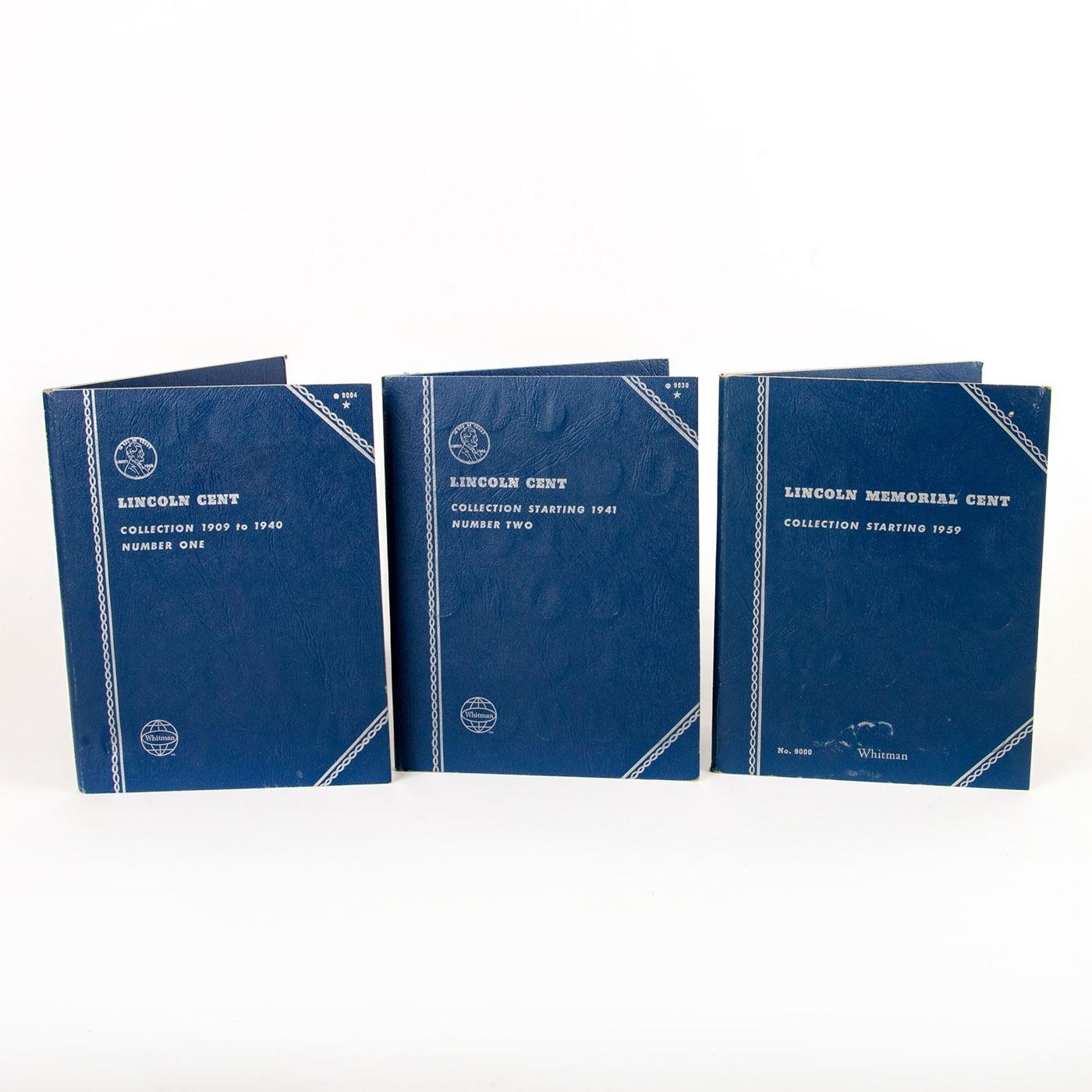 A group of albums for collecting Lincoln Head Cent copper and steel pennies. Mostly filled but incomplete books. Condition of coins vary. Coins and Currency, Numismatists