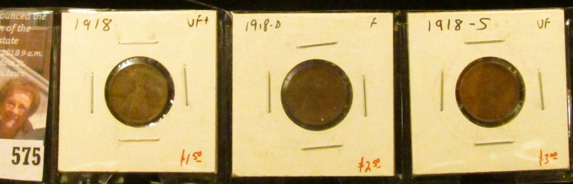 (3) Lincoln Cents, 1918 VF+, 1918-D F, 1918-S VF, group value $7