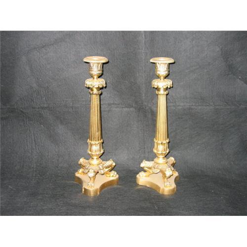 Original Casting Candlesticks. Three Leg Lion Paw Bases. Classic Design Restored Gold Dore 12.50"ht x 4.50" Base