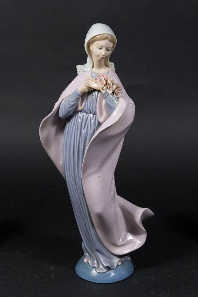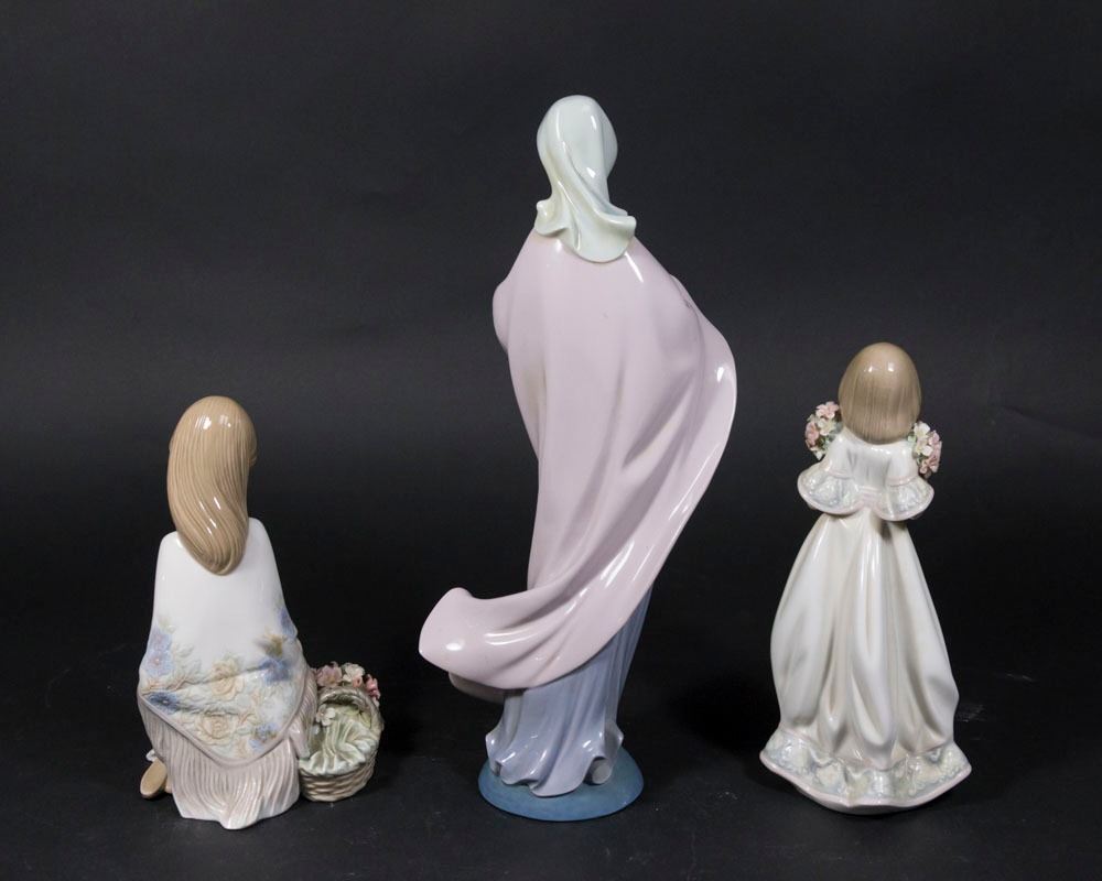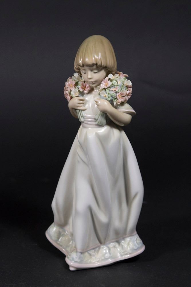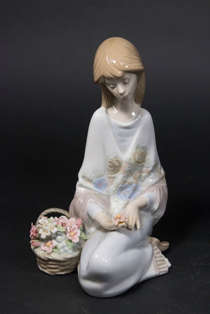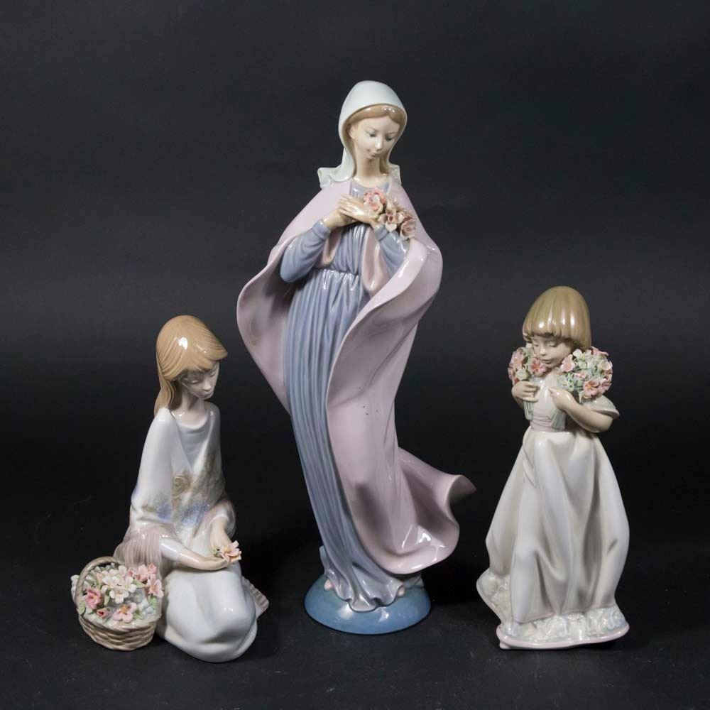 Including Society Collector piece - Girl with Flowers, #7603, approx. 8 1/4" H; Our Lady with Flowers, #5171, approx. 12 1/2" H; and Flower Song, #7607, retired 1989, approx. 7 1/2" H. (6072)