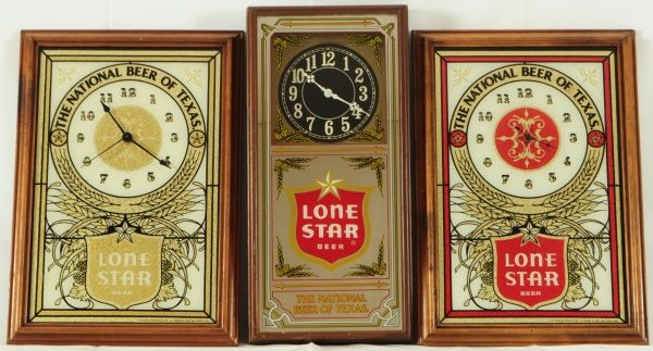 Lone Star Beer Gold Reverse Painted Glass Clock (frame is 14-1/2" W x 20-1/2" H); Lone Star Beer Red Reverse Painted Glass Clock frame is (frame is 14-1/2" W x 20-1/2" H); National Beer of Texas wall clock (10" W x 21" H x 2-1/2" D.