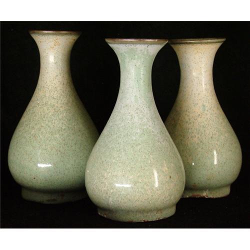 A rare find! (3)Mirrored Late Song dynasty to Early Yuan dynasty vases, ca.1100-1368. Dimensions: each vase is approximately 5-1/2" tall, by 3" diameter (widest). These 3 small vases are masculine in form. Most likely, these small vases originally served the purpose of medicine bottles. Each vase has an ample belly that stands on short, uneven and inverted foot rim. The body gently flares upward from the belly to a slender neck and then to a flared mouth rim. Each vase is glazed with a lustrous pale green glaze that has brown spots. Each vase also exhibits a beige or "chicken-bone" white glaze characteristic that can be seen on from the mouth rim (inside and out) downward into the foot rim. The mouth rims of each vase has a metalic appearance as well. Both of these effects are kn own as qin. Qin is formed when the tomb contents and earth disolve and metamorphasize with the glaze on the vases. This process take many hundreds of years to begin to form and is diagnostic of the authenticity of these vases Song/Yuan attribution. Qin cannot be replicated with modern forgery methods. Each vase has fine wondering crackling and one vase has a little glaze porosity in the neck area (see enlargements). The foot of each vase appears uneven and roughly finished. The exposed clay is reddish brown in color. The overall condition consensus is very good to fine condition with two vases with no injury and one vase having a small 3/4" chip that has been repaired. The repair was intentionally done ...