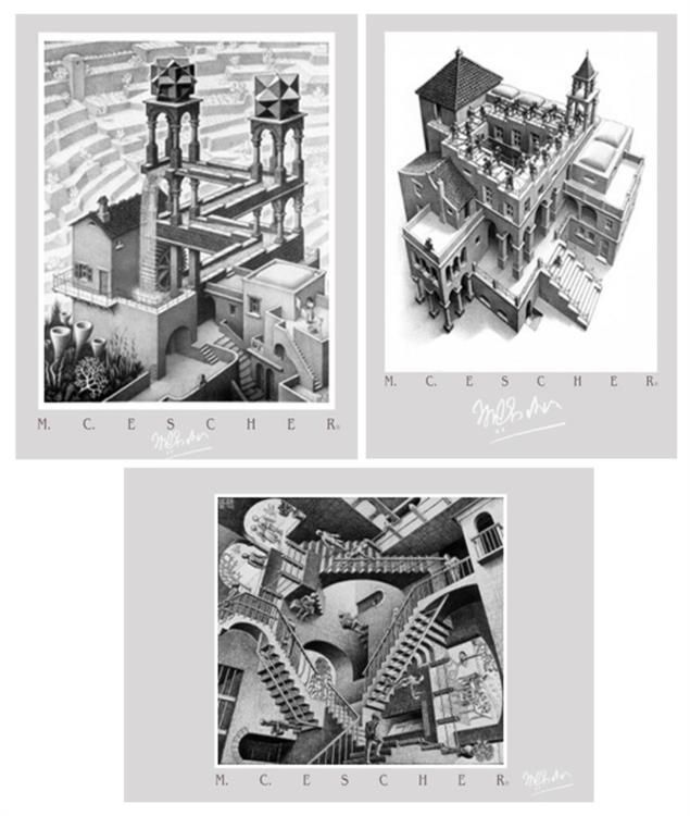 Artist: M.C. EscherTitle: Waterfall, Ascending and Descending, and RelativityMedium: PrintSizes: 27 1/2" x 19 1/2" and 19 1/2" x 27 1/2"Overall condition: ExcellentBiographyM.C. Escher (1898-1972) worked primarily in the media of lithographs and woodcuts, though the few mezzotints he made are considered to be masterpieces of the technique. In his graphic art, he portrayed mathematical relationships among shapes, figures and space. Additionally, he explored interlocking figures using black and white to enhance different dimensions. Integrated into his prints were mirror images of cones, spheres, cubes, rings and spirals. Escher was left-handedAlthough Escher did not have mathematical training-his understanding of mathematics was largely visual and intuitive-Escher's work had a strong mathematical component, and more than a few of the worlds which he drew are built around impossible objects such as the Necker cube and the Penrose triangle. Many of Escher's works employed repeated tilings called tessellations. Escher's artwork is especially well liked by mathematicians and scientists, who enjoy his use of polyhedra and geometric distortions. For example, in Gravity, multi-colored turtles poke their heads out of a stellated dodecahedron.