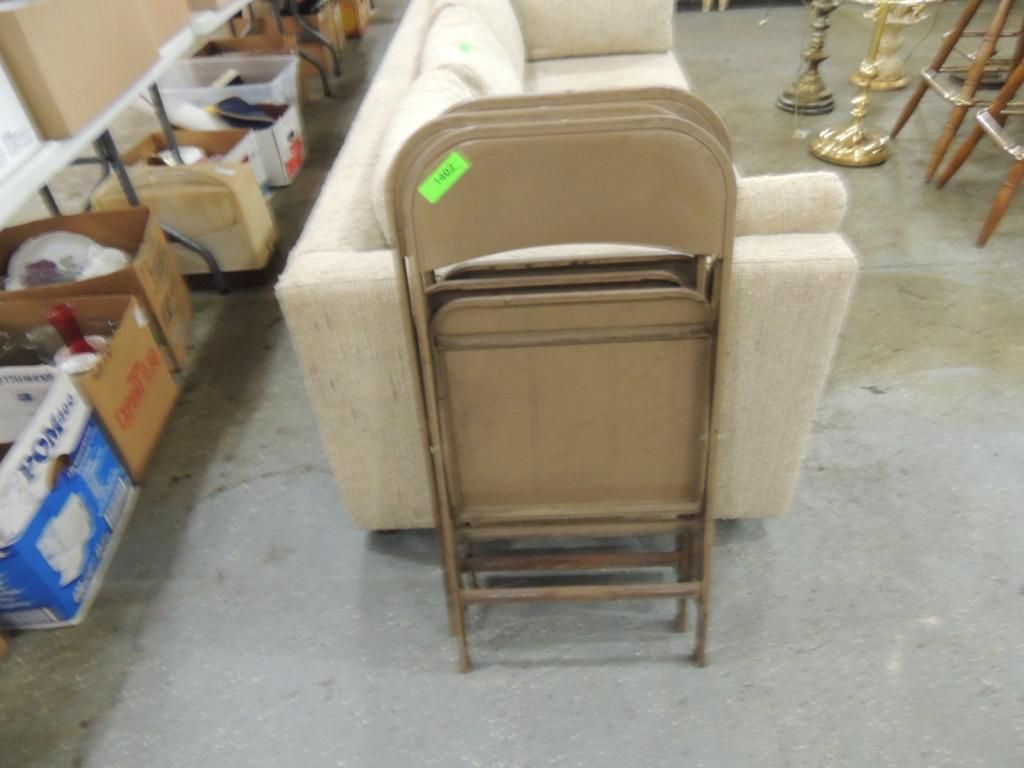 3 VINTAGE METAL FOLDING CHAIRS HOLDING METAL CHAIRS. EASY STORAGE AS SHOWN SEE PHOTO FOR MORE DETAILS.