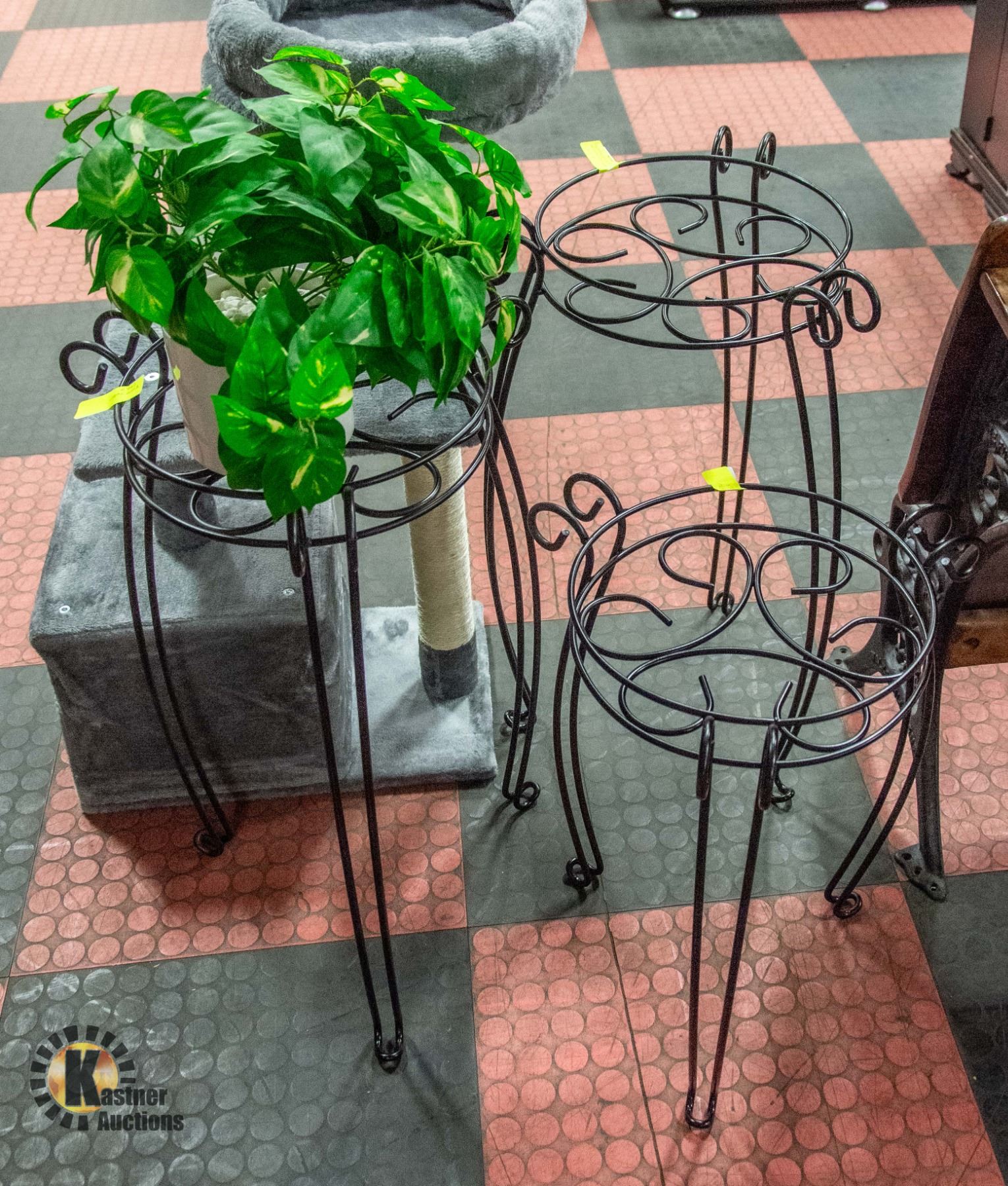 3 METAL PLANT STANDS WITH 1 ARTIFICIAL PLANT,