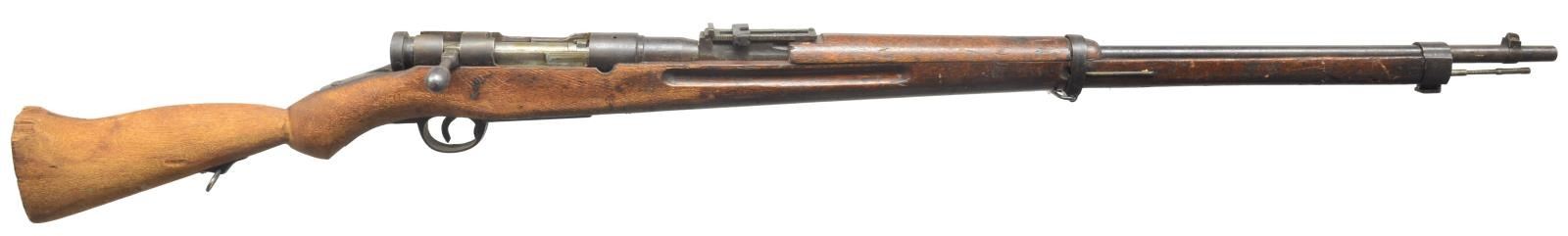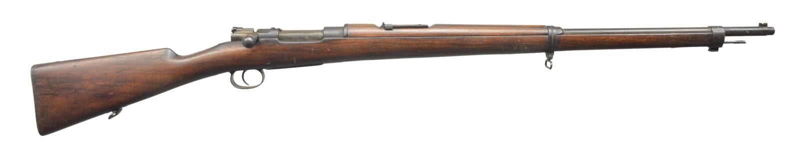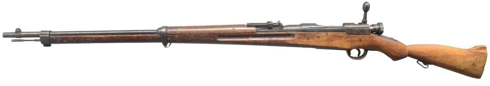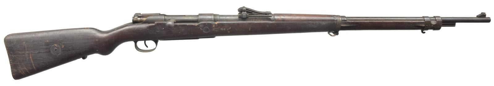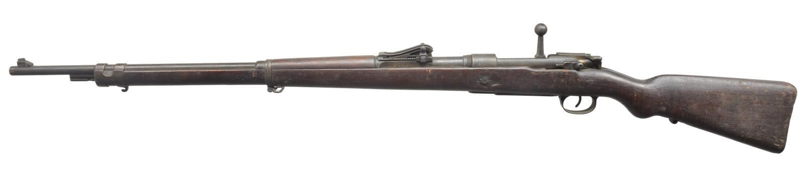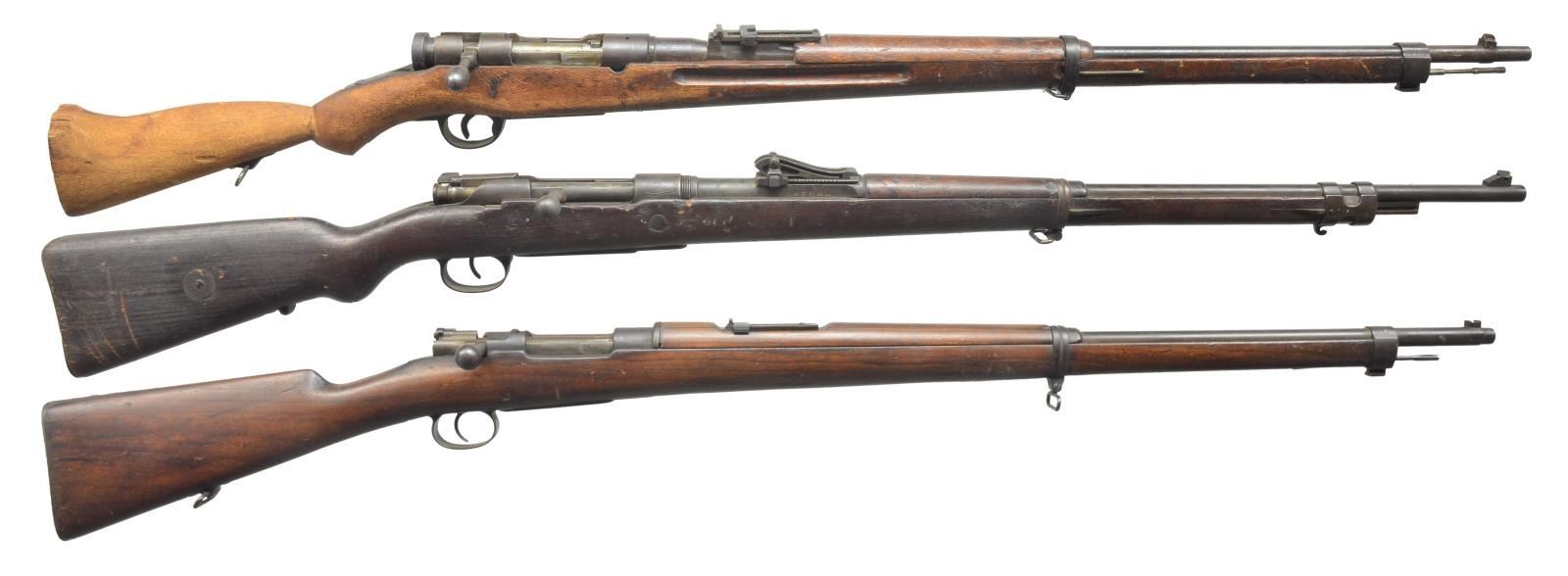 1) TYPE 38. Cal. 6.5 Jap. S# 57. Bbl. 30 3/4". S# 57 matches on integral receiver tang & bolt. Receiver is otherwise unmarked. Straight bolt handle w/ oval knob. Checkered lg. tang safety knob. Ladder rear sight graduated to 2400m. Inverted V front sight. 26" Cleaning rod is present. Upper band has bayonet lug. Trigger guard has integral tang. Butt swivel is stamped replacement. Buttplate is not present. Hardwood stock set. Buttstock has 1-piece construction but has been reshaped into much smaller configuration. Consignor tag stated modification was done by Phillipine freedom fighter. CONDITION: stock set has rough unfinished appearance around butt, retaining original finish forward of receiver area w/ extensive wear, dents, staining & scratches. Metal has traces of blue turning patina w/ wear, oxidation & pitting. Front guard screw is brass replacement. Bolt has appearance of late war workmanship. Poor worn pitted oxidized bore. (01-18732/RW). ANTIQUE. 2) MODEL 88 CONVERSION. Cal. 8mm Mauser. S# 7638. Bbl. 29 1/4". S# match on bolt & receiver. Rifle made up using Model 88 commission rifle receiver & bolt. Balance of parts including bbl., stock & trigger guard are from GEW98 Mauser. Bbl. appears to be turned fully home but has exposed threads around chamber area. Receiver marked on left side in script "Mod 88", marked on top w/ crown, "ERFURT 1889", "S" & Imperial proofs. Bbl. marked over chamber "S". Lange rear sight graduated to 2000m. Inverted V front sight. Has bayonet lug & parade hood. Walnut stock set w/ faint acceptance marks on right side of butt. Marking disk has "3". CONDITION: stock set has extensive wear & staining w/ dents & scratches throughout. Large crack behind receiver tang & sm. cracks along belly area. Handguard has crack below lower band. Metal turned overall gray & patina w/ wear, oxidation & light pitting. Trigger guard does not seat fully into inletting. Receiver & bbl. have wrench marks. Mag. is not useable due to internal configuration of Model 88 receiver rails. Extractor is not present. Heavily oxidized dark bore. (01-18733/RW). ANTIQUE. 3) SPANISH MODEL 1893 MAUSER. Cal. 7mm Mauser. S# C3322. Bbl. 29". All visible numbers match. Receiver marked on left rail "MAUSER ESPANOL MODELO 1893 MANUFACTURA LOEWE BERLIN" & six pointed star. Receiver ring marked on top w/ Spanish crown & "BERLIN 1894". Straight bolt handle. Ladder rear sight graduated to 2000m. Front sight is not present, leaving only front sight base. Replacement cleaning rod. Matching walnut stock set. CONDITION: original finish stock set has light to moderate wear, staining & scratches throughout. Buttstock has 4 added holes at top: 1 through buttplate tang & 3 in top rear of comb. Metal has traces of original blue turning patina w/ oxidation & light wear. Dark oxidized bore. (20-2981/RW). CURIO. $500-700.