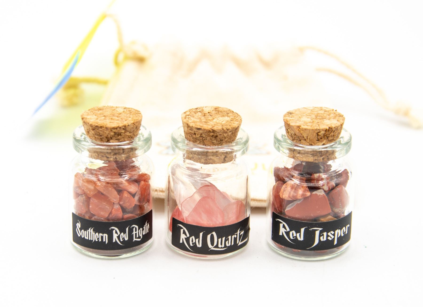 3 MINI CORK LID JARS OF GEMSTONES: RED QUARTZ, RED