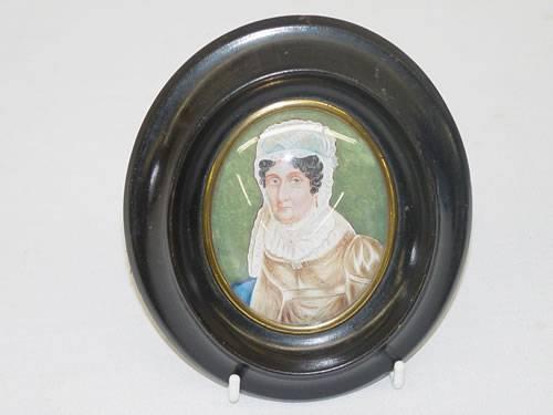 3" MINIATURE WATERCOLOR - OVAL PORTRAIT OF A LADY IN A LACY BONNET IN A BLACK OVAL FRAME;