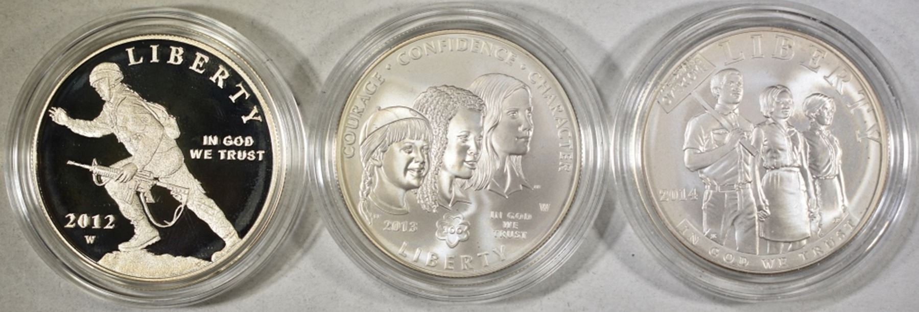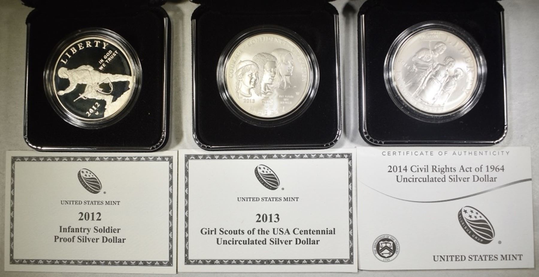 2012 INFANTRY SOLDIER SILVER $1, 2013 GIRL SCOUTS SILVER $1, & 2014 CIVIL RIGHTS ACT OF 1964 SILVER DOLLAR ESTIMATE $120 - $130.