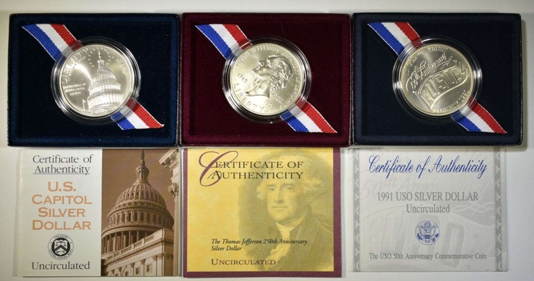 1991 USO, 1993 JEFFERSON & 1994 U.S. CAPITOL  ORIG PACKAGING ESTIMATE $80 - $100.