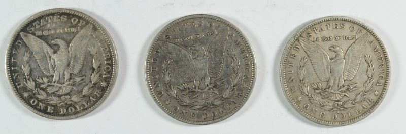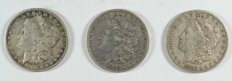 3-MORGAN SILVER DOLLARS, 1882 VF, 1883 VF & 1882-S XF