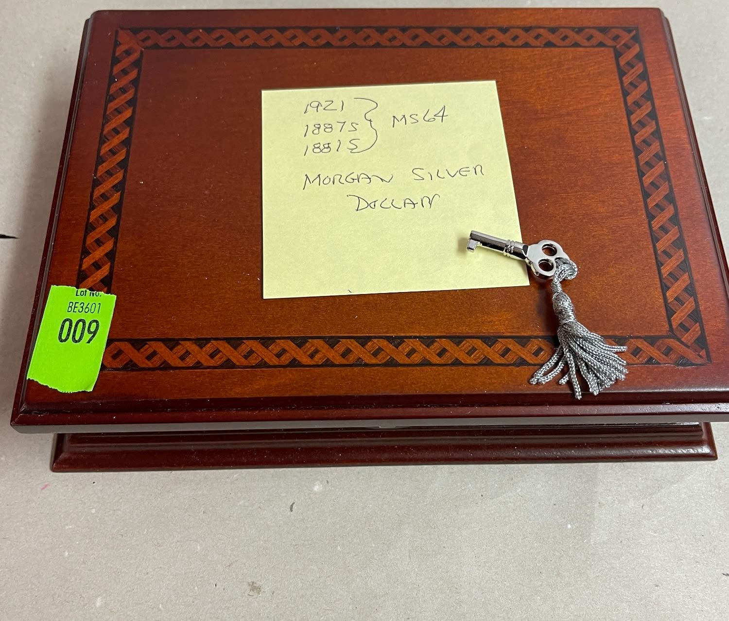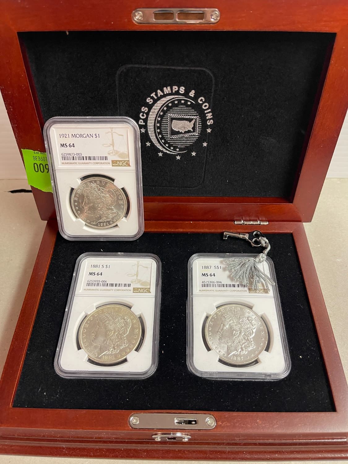 3 MS64 Morgan Silver Dollars, 1887, 1882 "s", 1921. Collection is in a beautifully fitted locking box. This is from a lifetime private collection , owner is in his 80's.