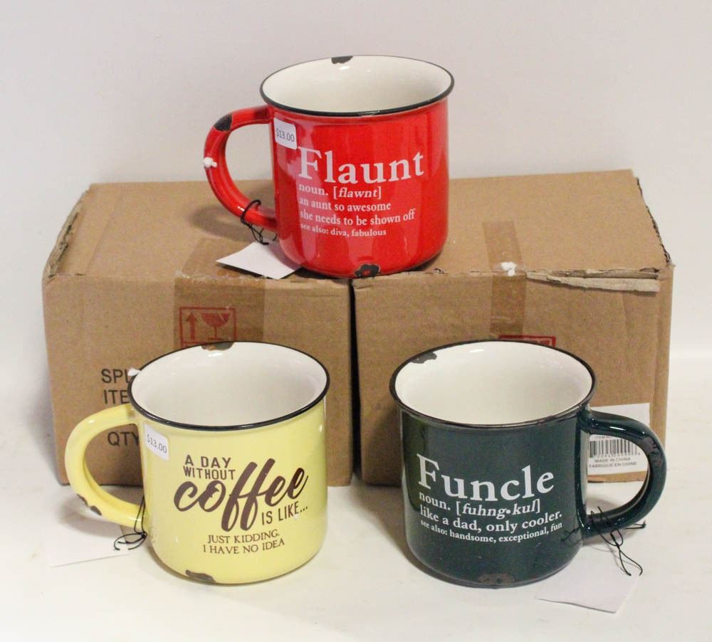3 MUGS WITH BOXES - FUNCLE, FLAUNT, COFFEE