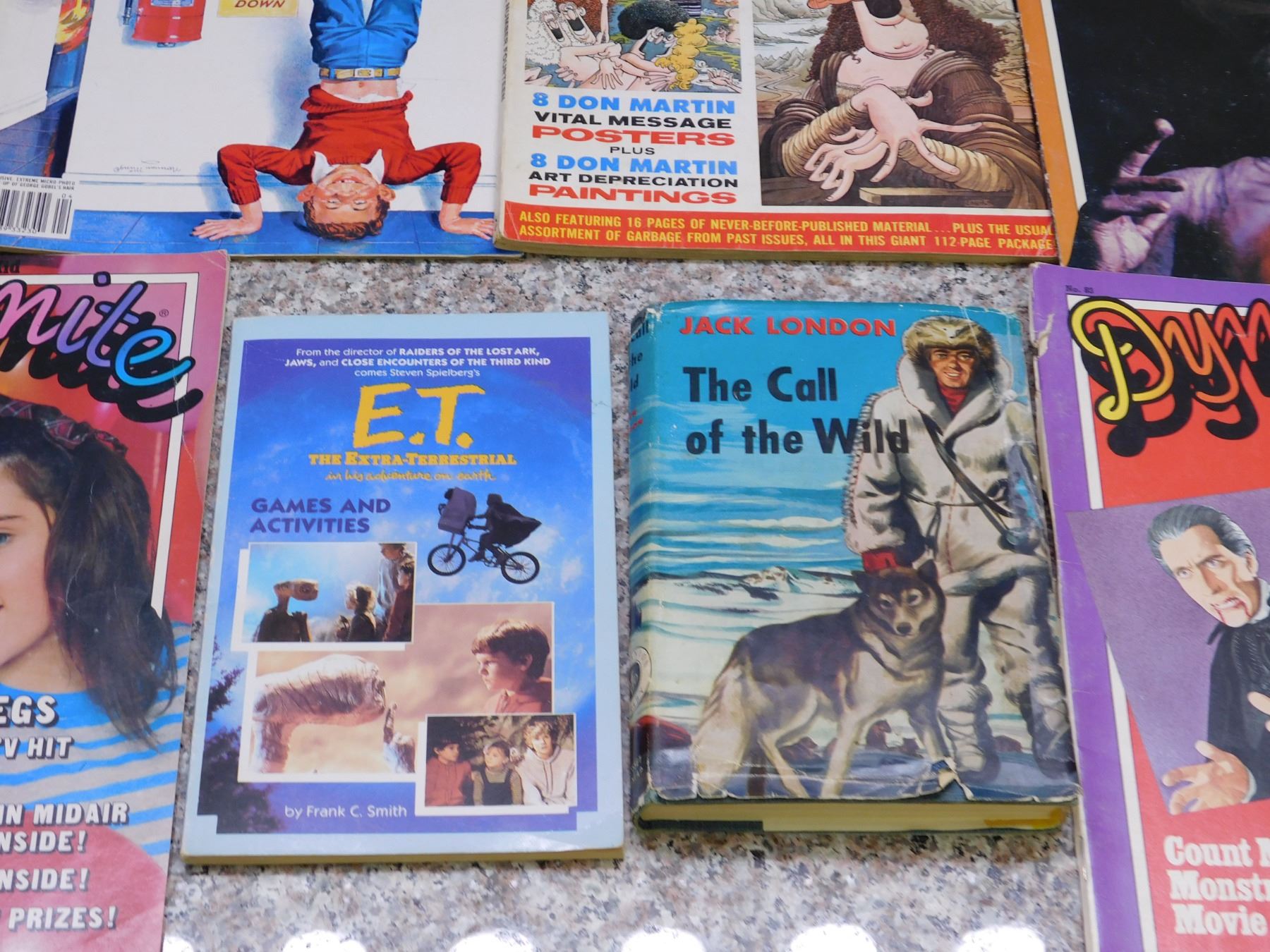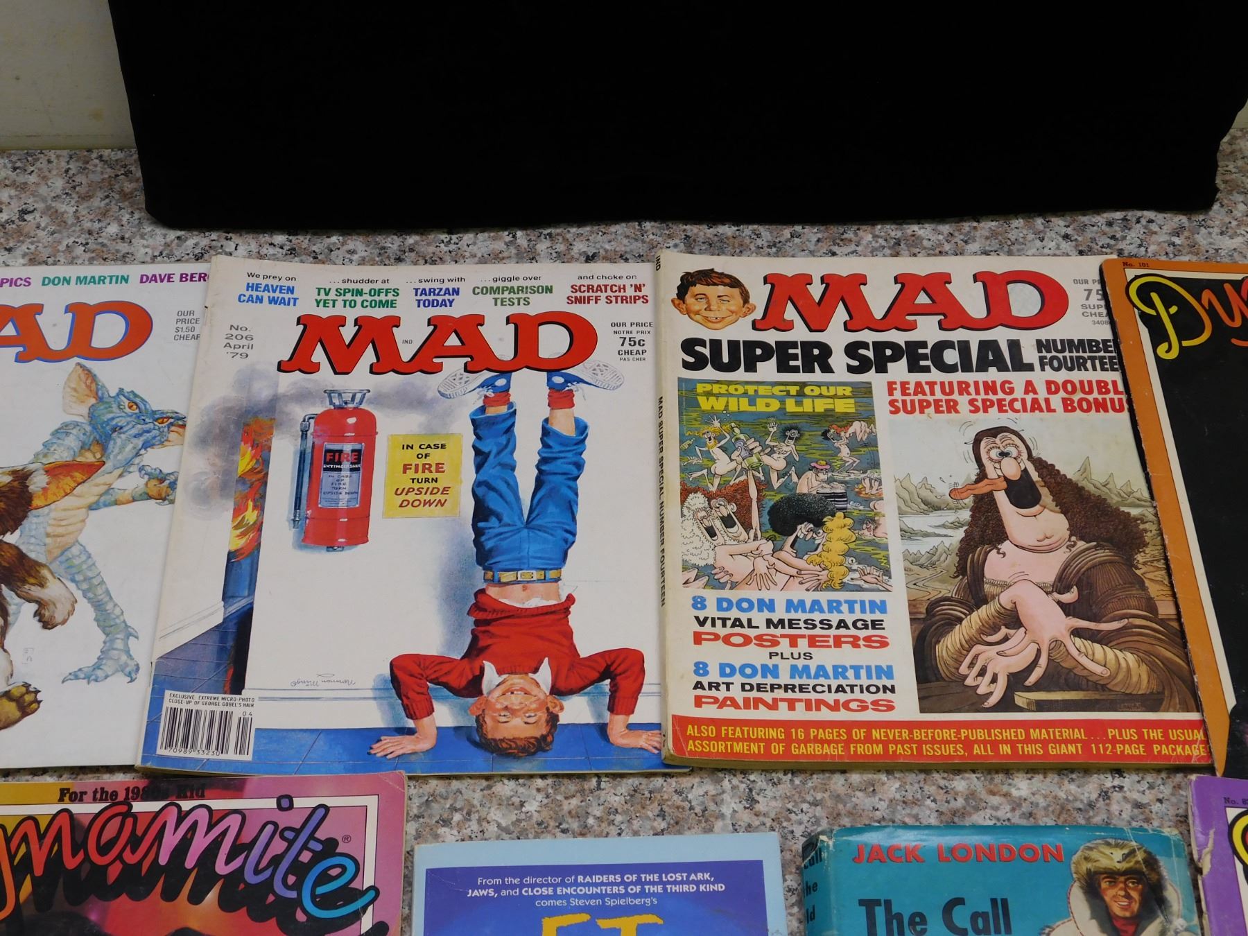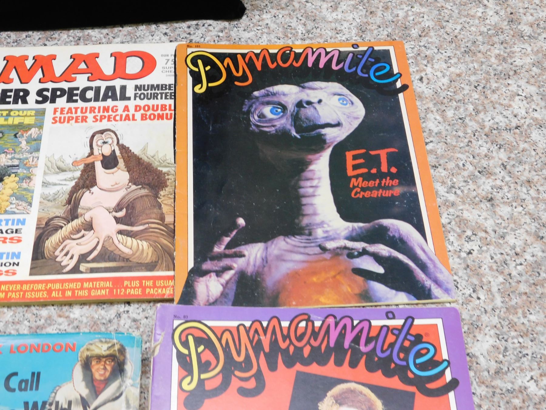 3 Mad Magazines No. 14, 206, 249 (Gremlins), Jack London Book, E.T. Game book, 5 Dynamite