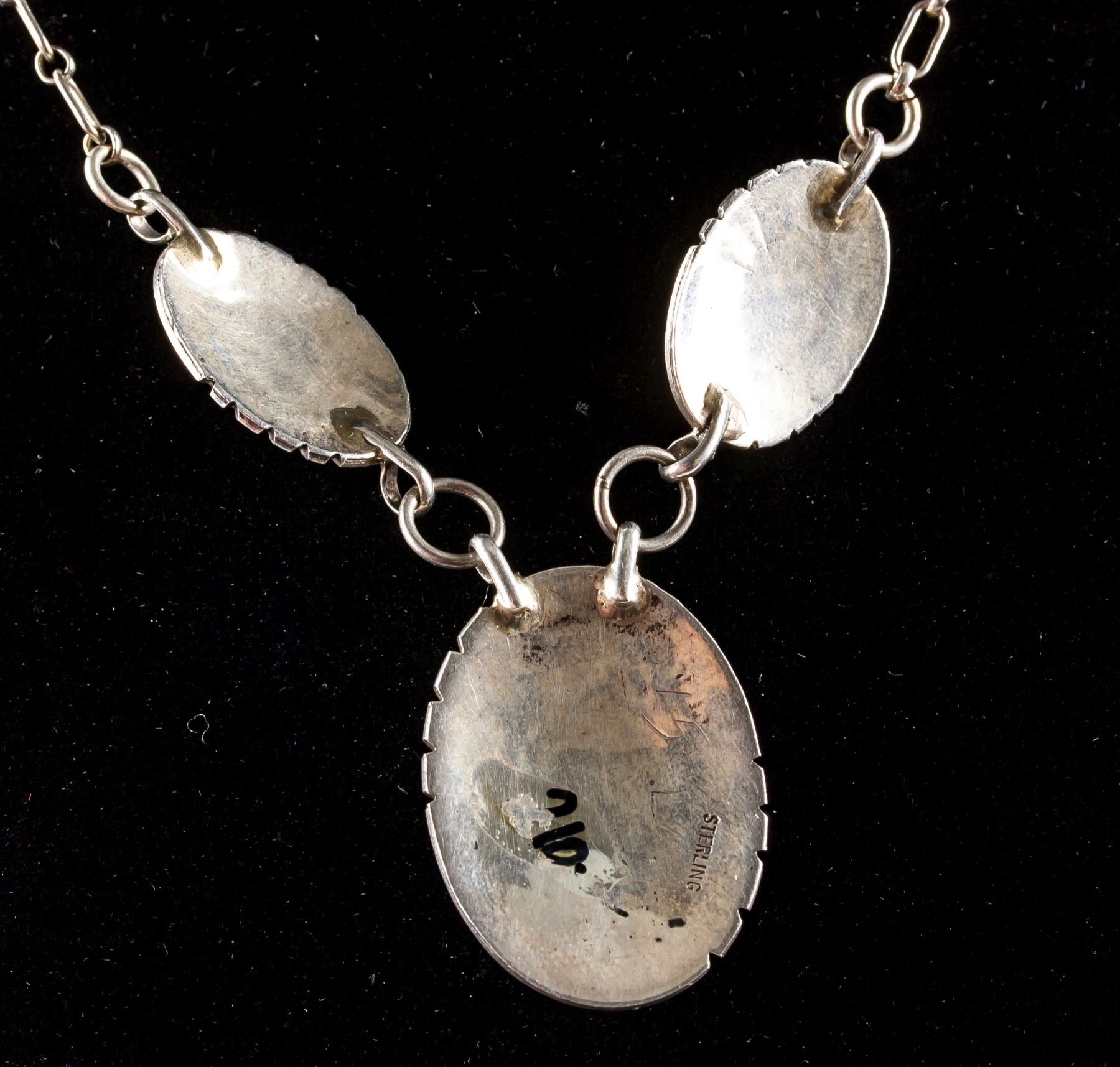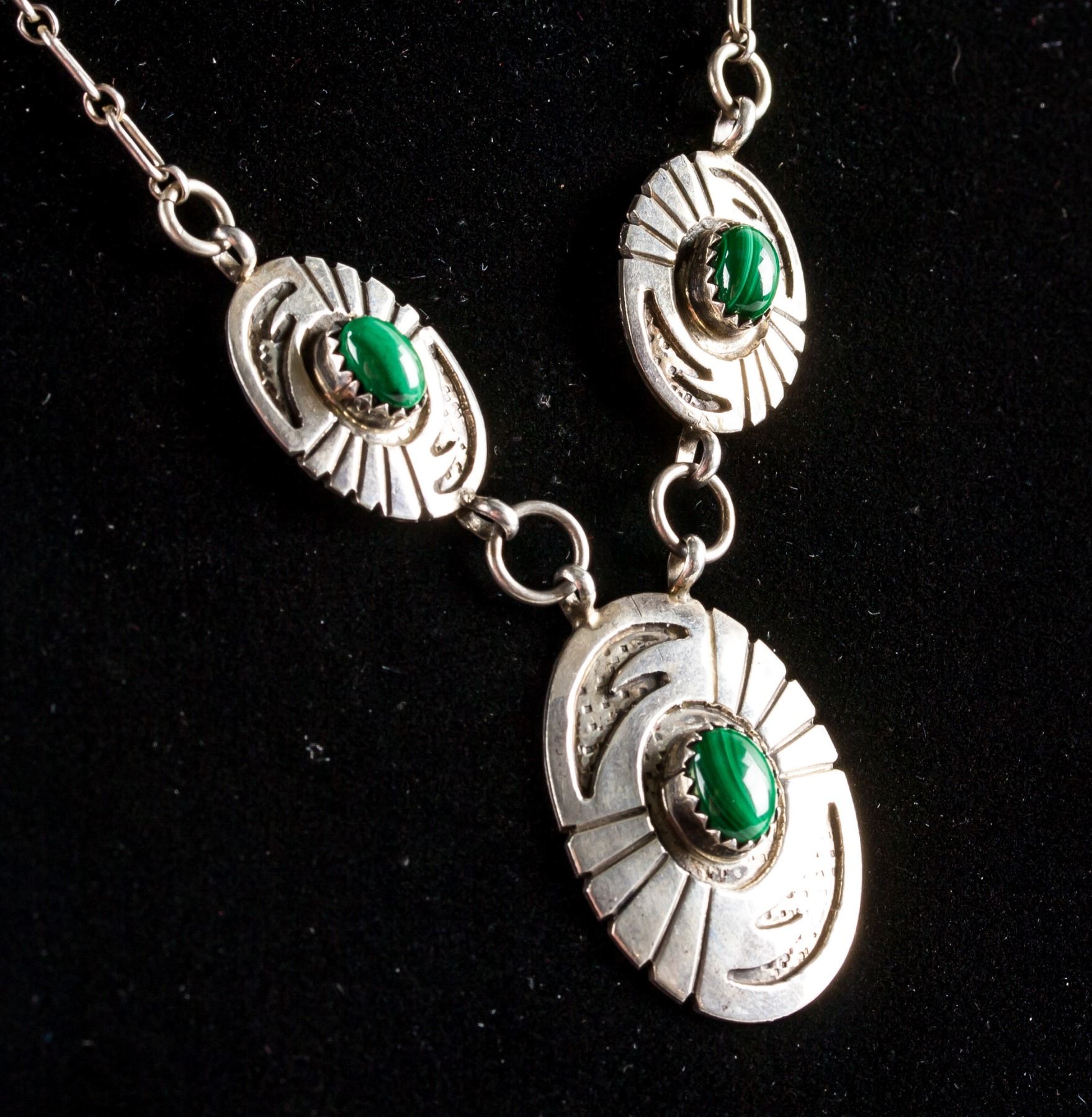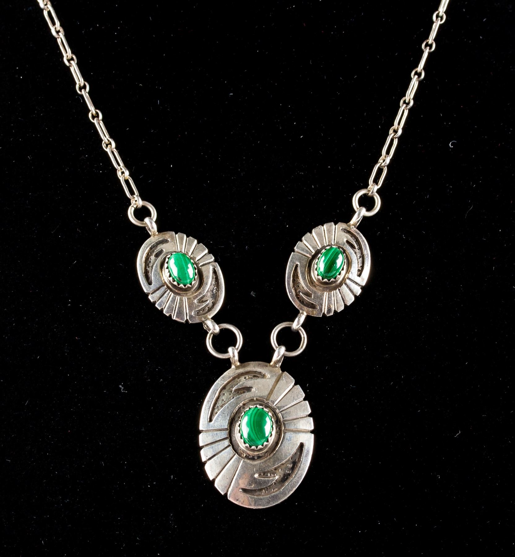 Stamped Sterling silver necklace. Set with 3 malachite stones. 22 cm, 13 grams