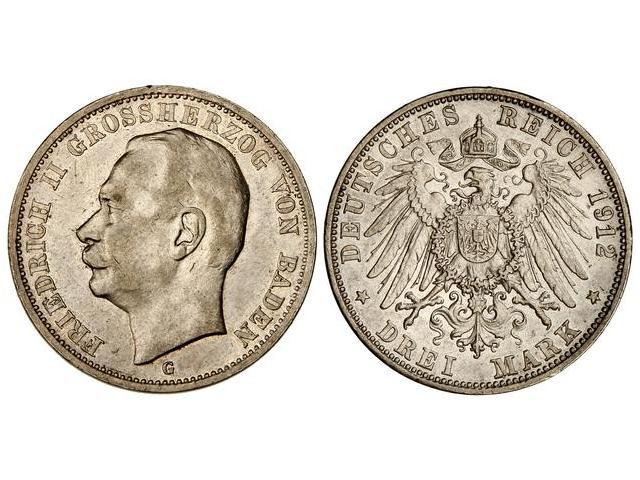 3 Marcos. 1912-G. FEDERICO II. BADEN. AR. (Pequeños golpecitos en anverso). KM-280. MBC+/EBC-.
