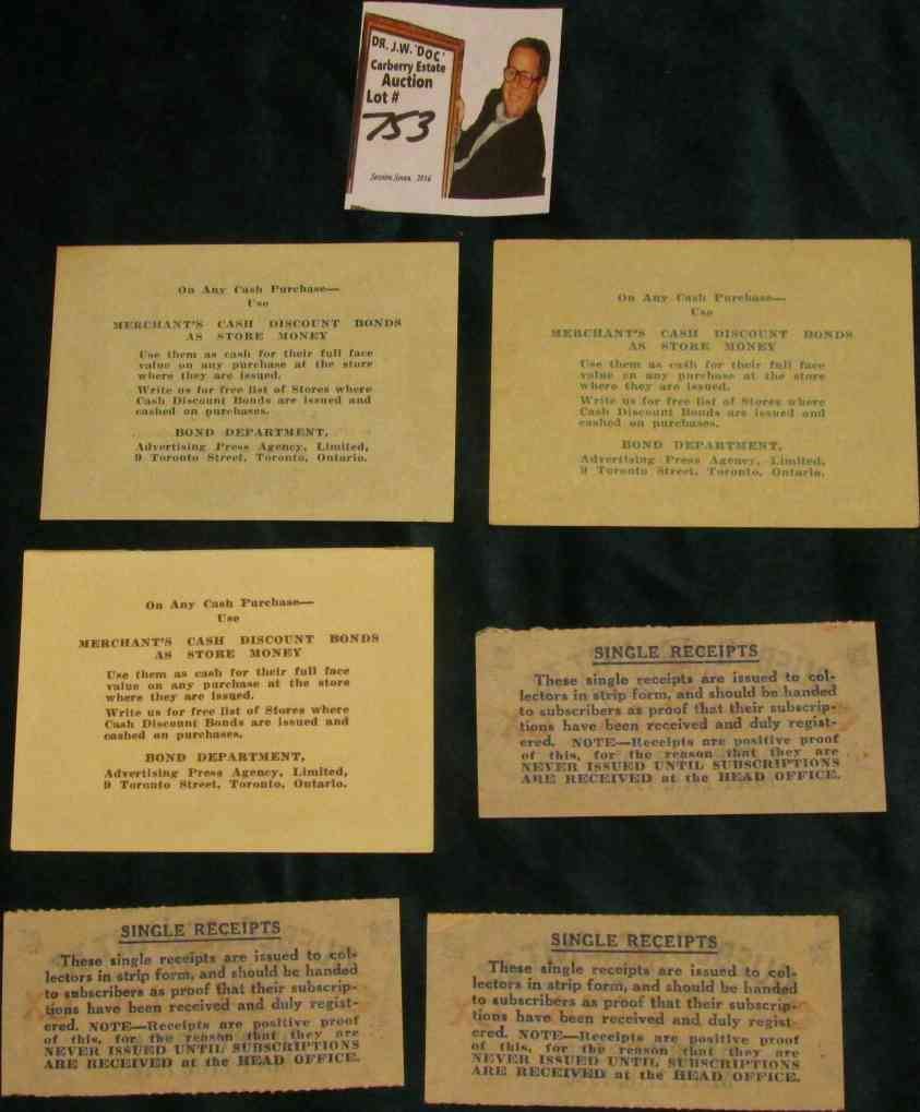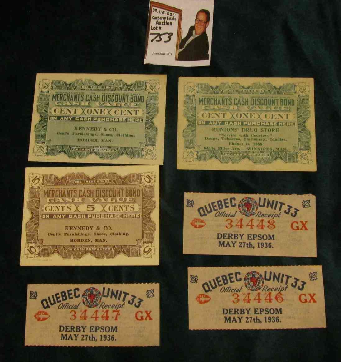 (3) May 27th, 1936 "Quebec unit 33 Official Receipt Derby Epsom(s); (2) 1920 era One Cent Scrip "Runion's Drug Store…Winnipeg, Man."; & 5 Cents Scrip Merchants Cash Discount Bond Kennedy & Co. Morden, Man.