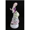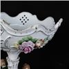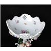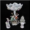 1) Porcelain compote with 4 figures at base. [14 1/2" H x 10 1/2" D]. Bowl separates from stand. In very good condtion. 2) One female figure [7 1/2" H x 3" Dia]. Chipped left shoe and left pinky. 3) Urn with porcelain flowers [8 3/4" H x 2 1/2" Dia.]. Leaves are chipped.