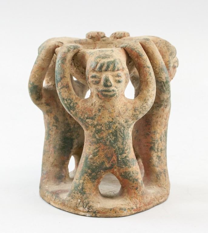 Green and sand color ceramic statue. Featuring three figures holding up a bowl together. 15 x 15 cm, 964 grams.