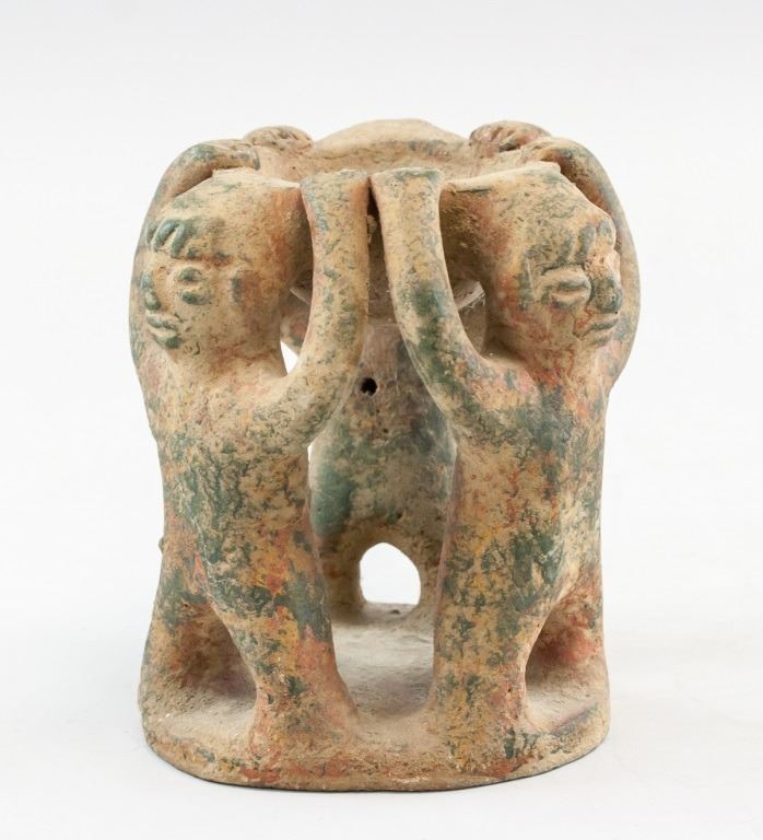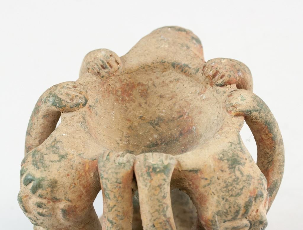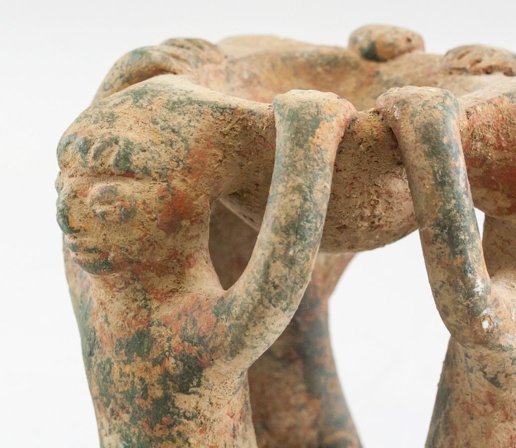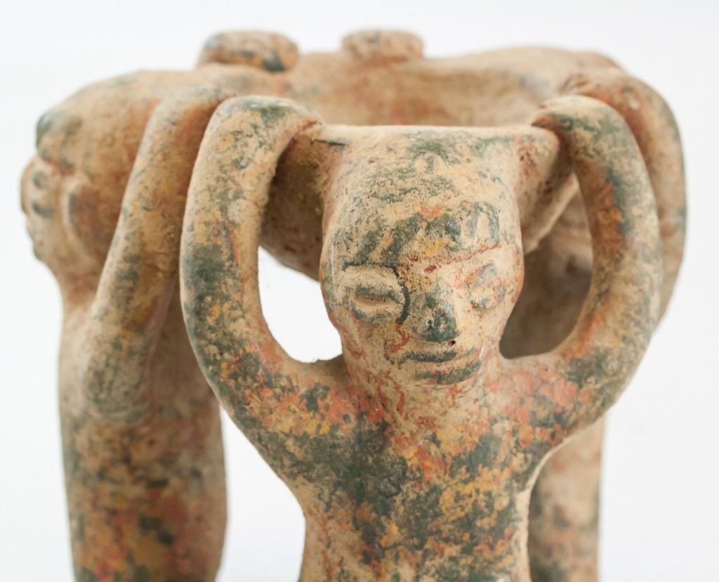 Green and sand color ceramic statue. Featuring three figures holding up a bowl together. 15 x 15 cm, 964 grams.