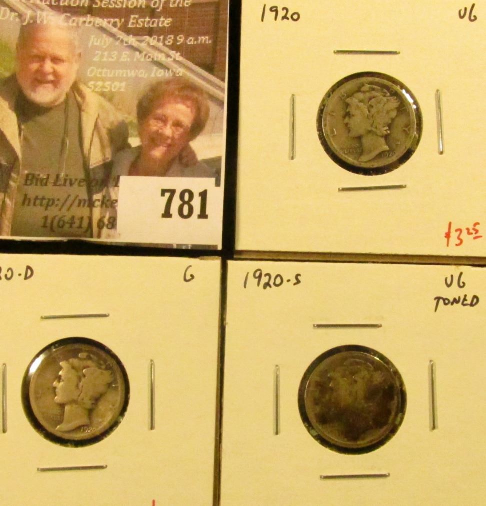 (3) Mercury Dimes, 1920 VG, 1920-D G, 1920-S VG toned, group value $10+