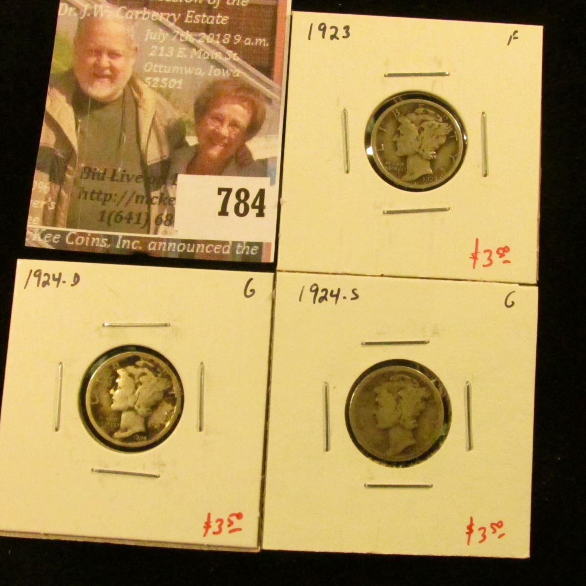 (3) Mercury Dimes, 1923 F, 1924-D G, 1924-S G, group value $10+